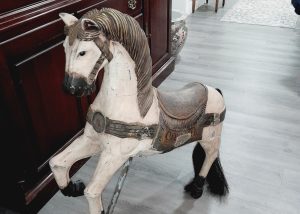 This is a Vintage French Wooden Carousel Horse, heavy in weight and hand carved, Circa early 1900’s.These Carousel horses, often found on merry-go-rounds, were particularly popular in the United States from the 1880s to the 1920s. They are considered examples of American folk art, with original figures sometimes selling for thousands of dollars. The saddle and blanket on this horse are ornately carved with detailed designs.This horse is a “stander” type, which typically has 1-2 hooves on the ground and 1-2 hooves raised. It stands 34 inches high x 29 inches long.