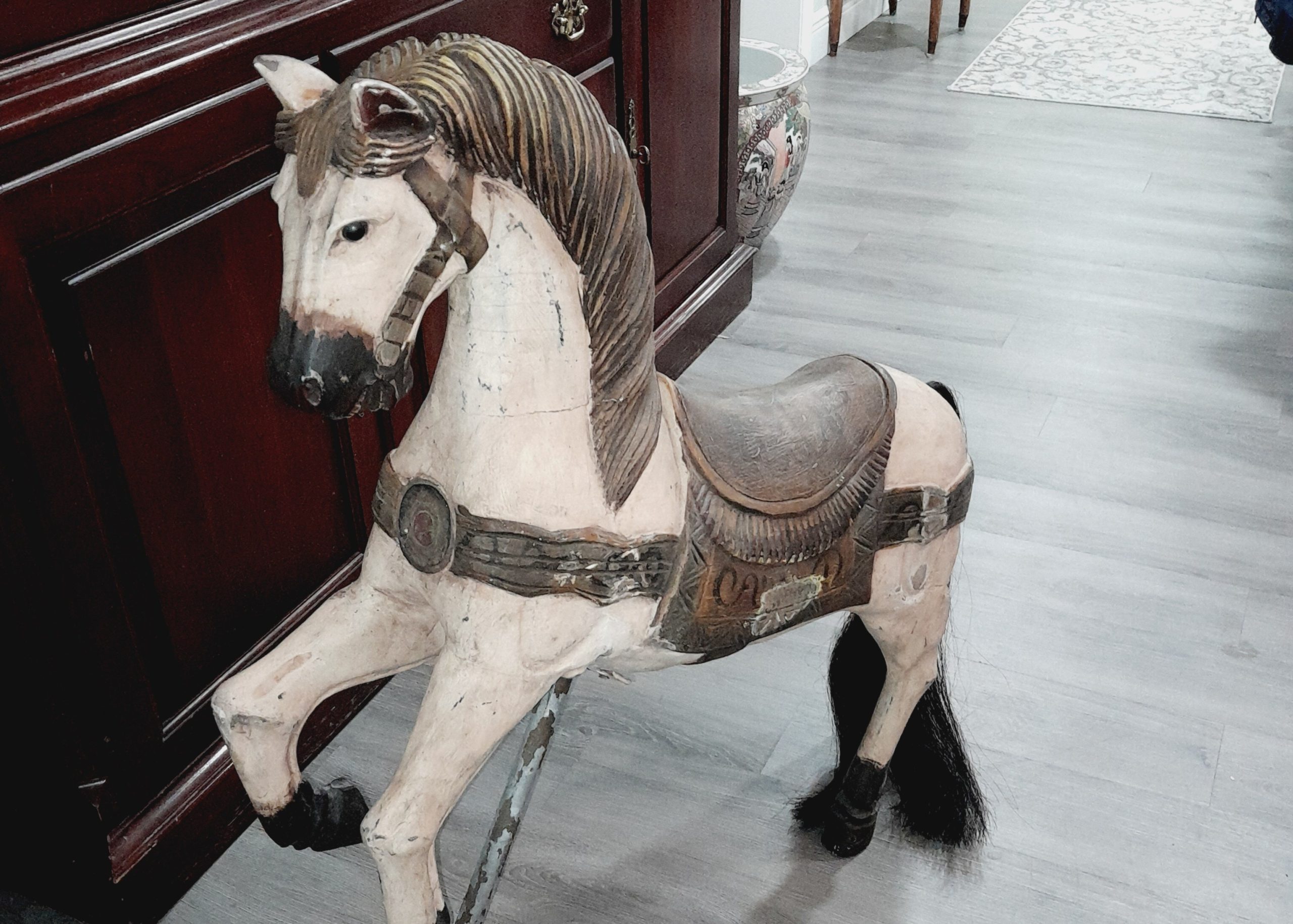This carved and painted wooden horse is supported by a metal platform attached to the underlying part which holds the horse rearing up.Hand-carved from wood, it weighs over 70 pounds and was part of a full-size carnival ride. Its intricate carved details and beautiful design make it a must-have for anyone who appreciates the artistry of early 1900s carousel horses.The tail is real horse hair and is in excellent condition. This horse has glass eyes, please see the photos for overall very good condition. This beautiful carousel horse is an true antique and does show signs of wear due to age. The horse is in great shape and has been well-maintained over the years. It would make a wonderful gift for anyone who loves carousel horses or vintage amusement park memorabilia. Its elegant design and beautiful craftsmanship make it a true treasure that will be cherished for years to come.