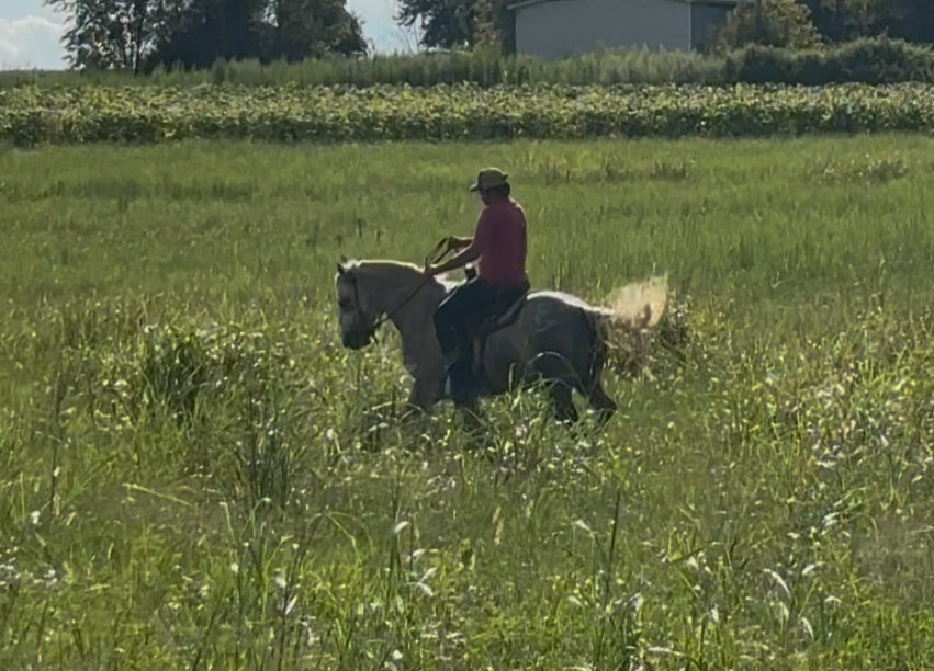 Sterling has extensive experience in the sale barn and most all facets of ranch work. He has been used to pen, sort, and load cattle, and performs reliably in a variety of working environments. Possessing a strong stop, correct spins in both directions, and the stamina to work sunup to sundown, he is the ultimate ranch horse. Sterling's the kind you can saddle in the morning, work on all day, and count on to get the job done every time, with a soft, responsive handle that lets you put him exactly where you need him.