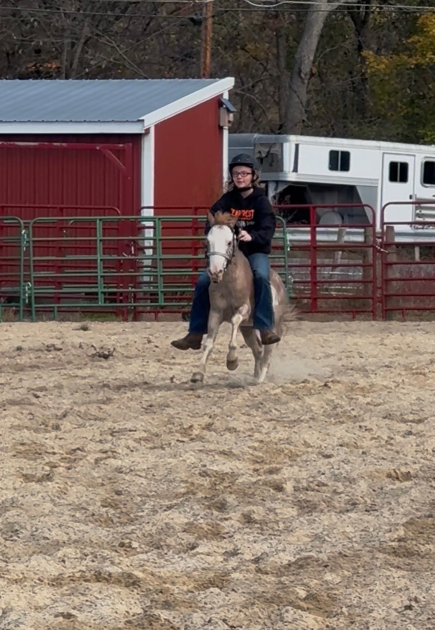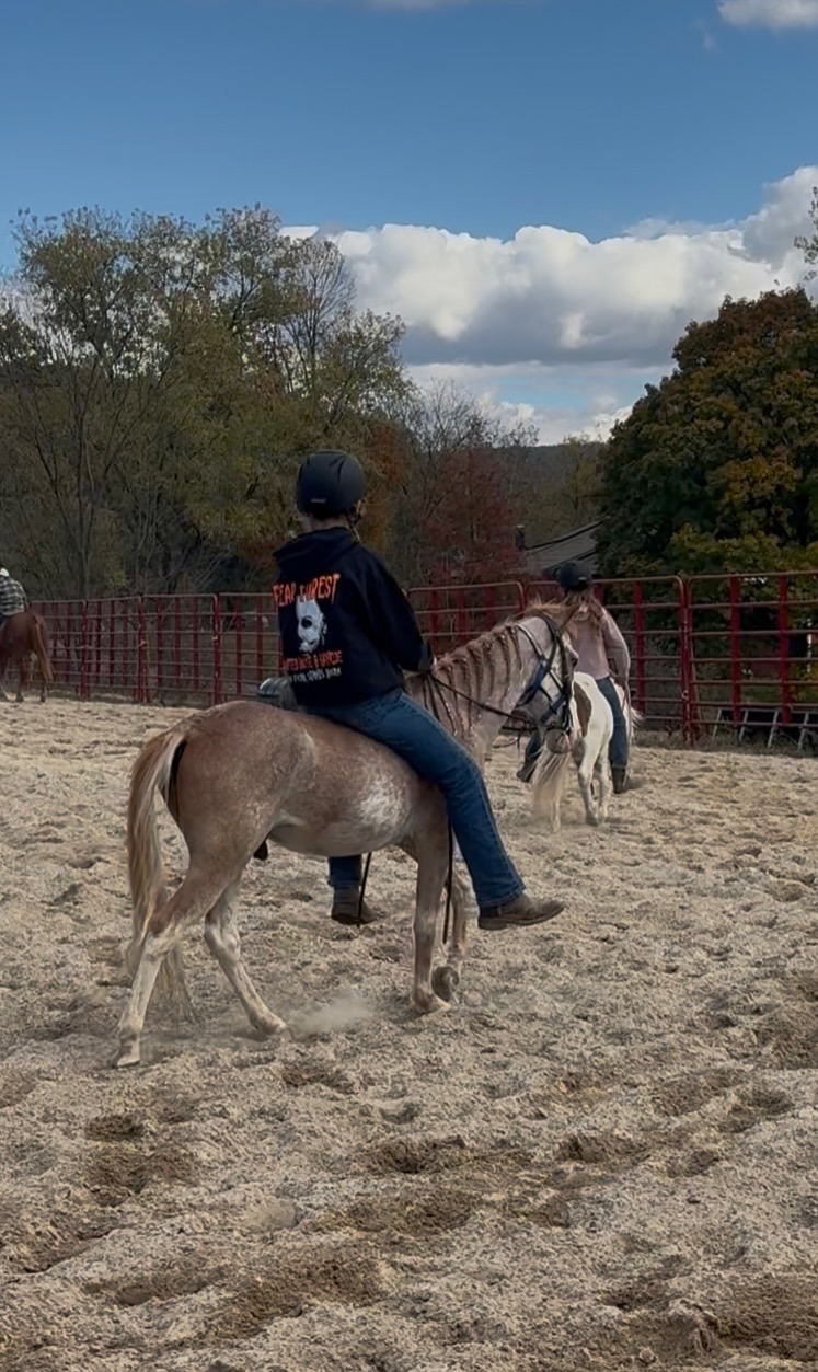 Description: Macaroni (Roni) is a 3 yr old 12 hand Strawberry Roan Paint Pony. He is broke very well for his age. He has been to fun shows, trail ridden, on the road and in the arena. He will take a jump nicely. He stands well for the farrier and has very good ground manners. He loves attention and cookies. He would make an awesome 4H pony/ lesson pony or English prospect. He is suitable for any level Rider. He rides double. He has a very bright future ahead and is wise beyond his years. He doesn't act like a 3 year old. He has show stopper looks.