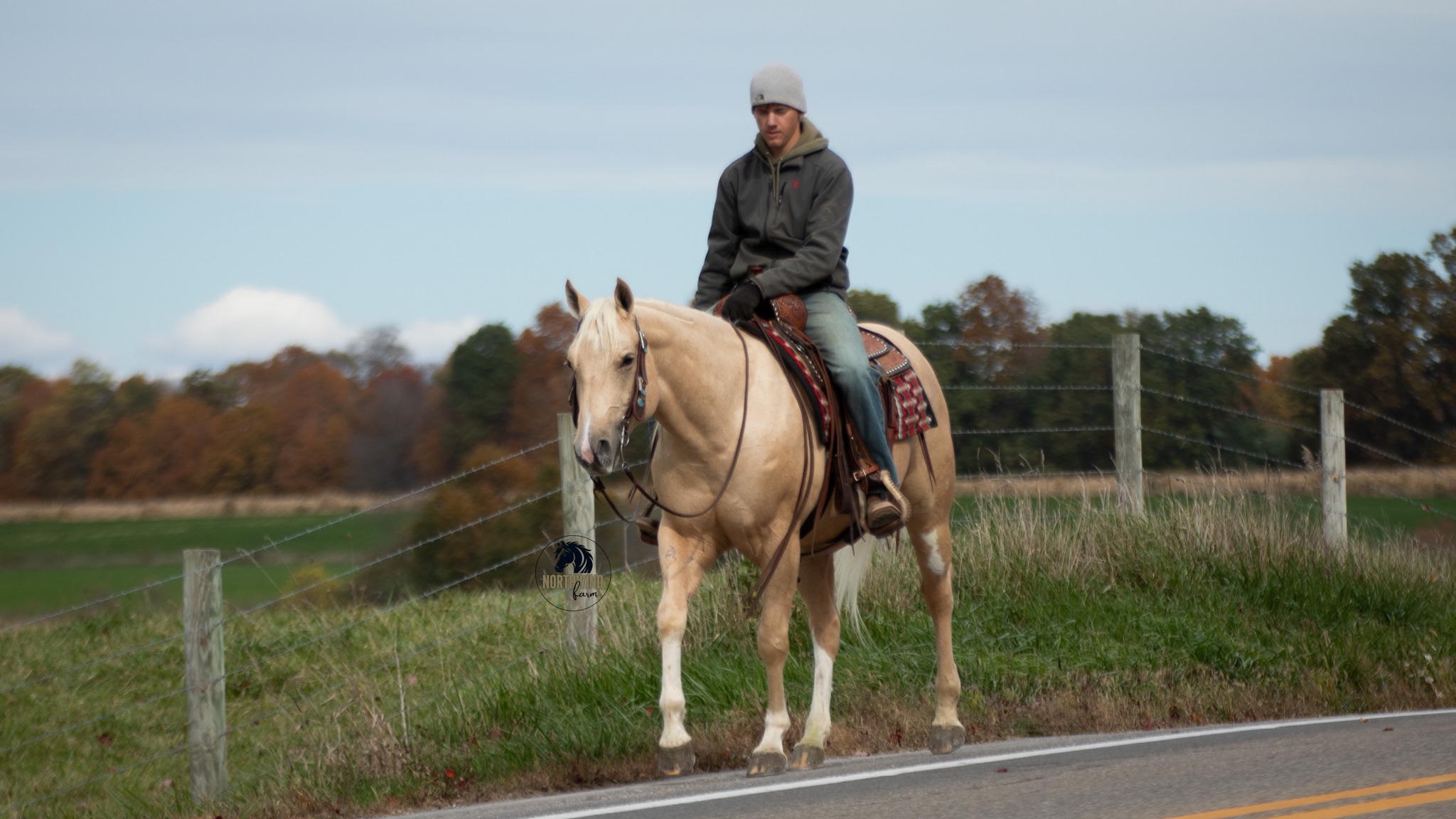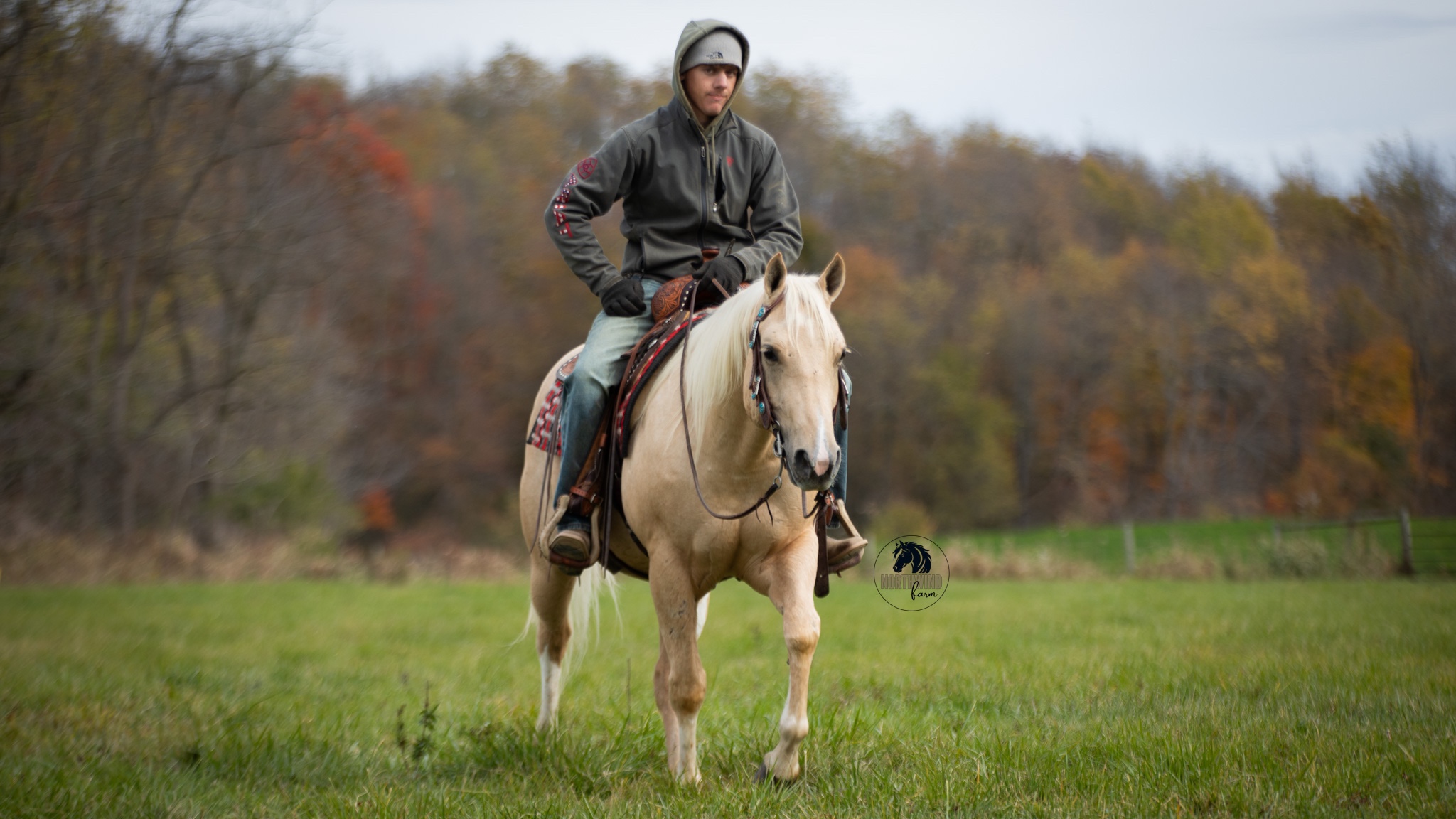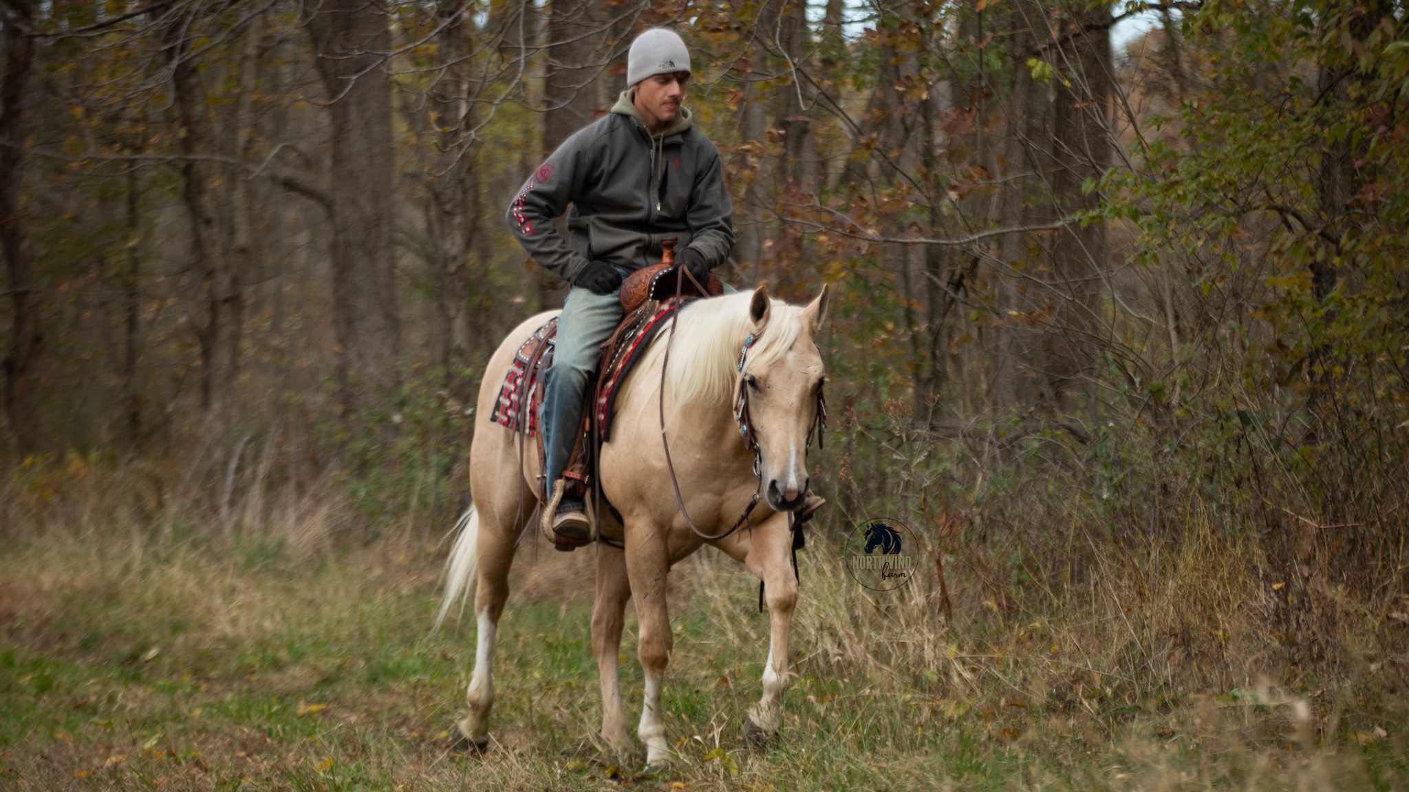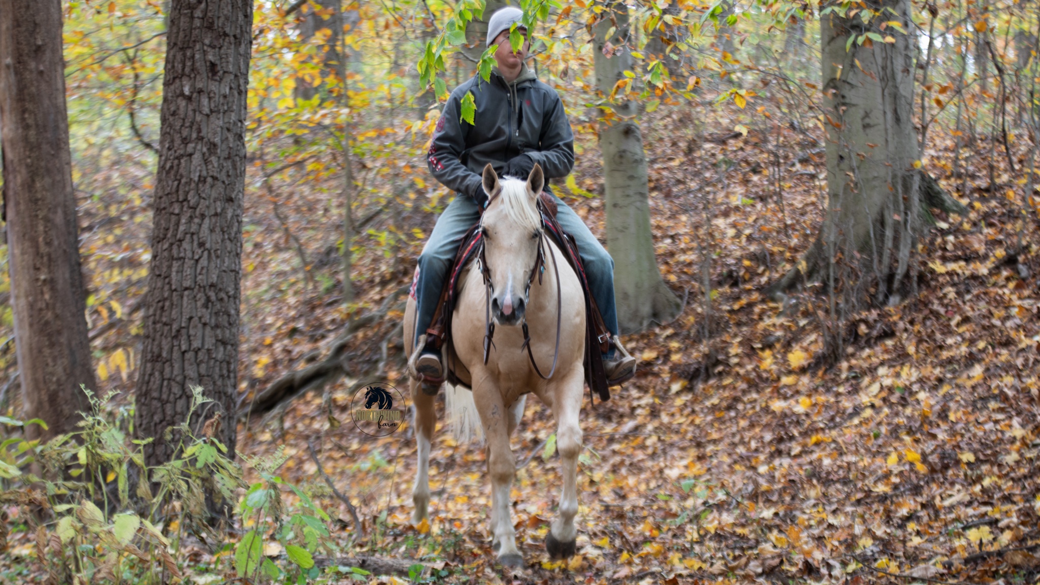 Description: GoldRush is a 5 yr old grade palimno quarter horse gelding standing at 15hh! GoldRush is very well trained to ride! He has a lovey personality and enjoys attention! He has good ground manners, he stands good for grooming, tacking up, and for getting bathes! He loves being out in the pasture! He is good with others horses and is in the middle of the pecking order! He is easy to catch in the field as well! He is good with the farrier and up to date on shoes! He is safe and gentle for all levels of riders! Goldrush rides nicely in the arena, he picks up both his leads, he stops good, and has a nice back up! He will neck rein, direct rein, and move off of leg pressure! He is easy to ride! He has very smooth gaits! His walk, trot, canter, is fun to ride! He is a beautiful mover! GoldRush is a star out on the trails! He is used to seeing cows, wildlife, and dogs! He is very confident and will cross anything you point him at! He doesn’t hesitate to cross creek, he steps over logs, and is surefooted going the hills! He will go through all the obstacles and doesn’t mind the tarps or the ball! He has been rode on the state route and is traffic safe! He is also used to being around farm equipment and ATVs! GoldRush is 100% sound and requires no maintenance! Contact us for more info or to meet GoldRush!