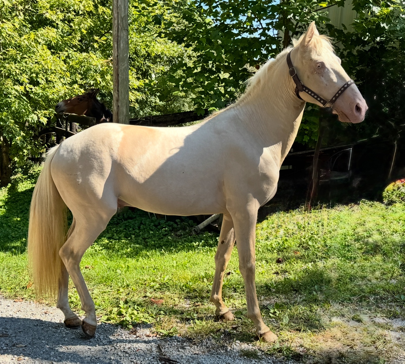 Description: George is a beautiful Cremello gelding. Has a very nice gait. Trail horse deluxe, he will follow on the trail or he will lead. He rides away from the party with ease. He crosses creeks and wooden bridges. He likes to poke along but will saddle when asked. Heβs been on tons of trails and he loads and ties with ease!
