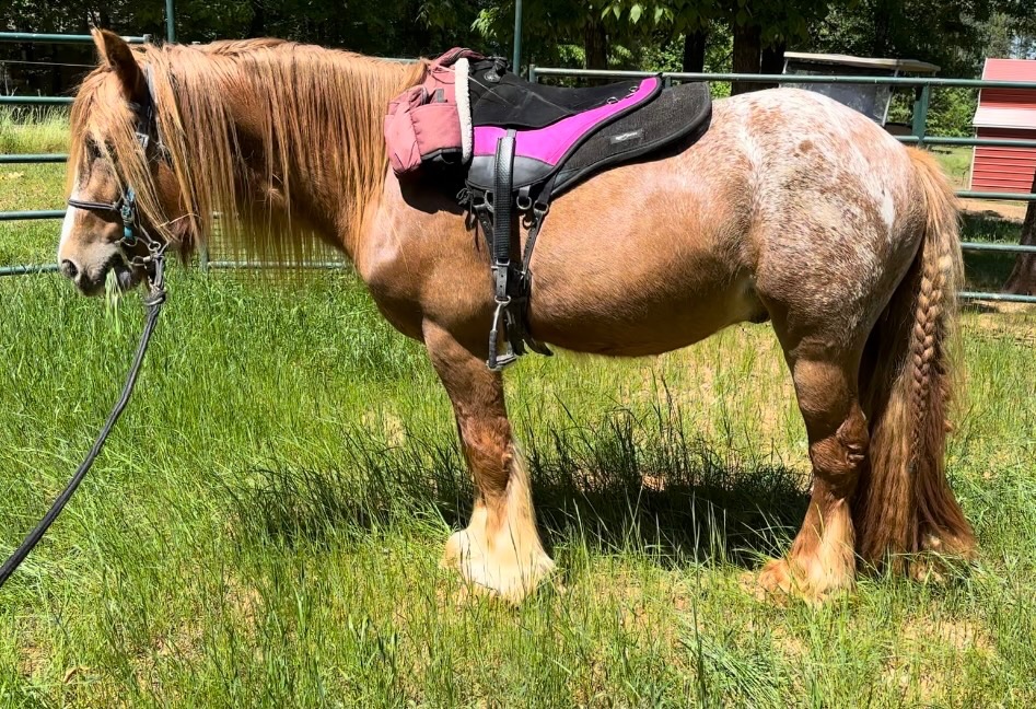 13.3hWell started under saddle. More whoa than go. He’s young and still has lots to learn but he is super safe for anyone who knows the basics, to ride. Perfect kids horse or for an older rider who just wants to have a relaxing ride. While he is pony sized, he does not ride like a pony and has a great trot and beautiful, smooth canter. He will trail ride like a champ. “Jamie” was shown as a yearling at the Feathered Horse Classic and did really well. He lives out in a pasture with mares and geldings and gets along with everyone. No vices, no health issues and has never taken a lame step. PPE’s welcome at your expense. UTD on worming and VX. Clips, ties, loads, bathes, stands for farrier. Conditioned to aerial fireworks and gunshots (up to 50ca). He’s pretty unflappable and not a thing wrong with him! He’s a great driving prospect as well.