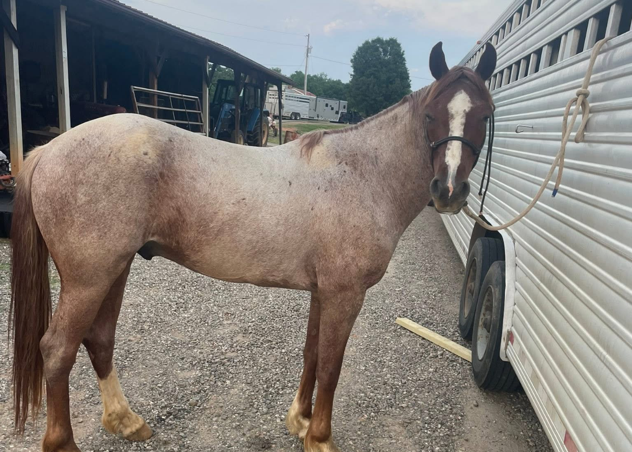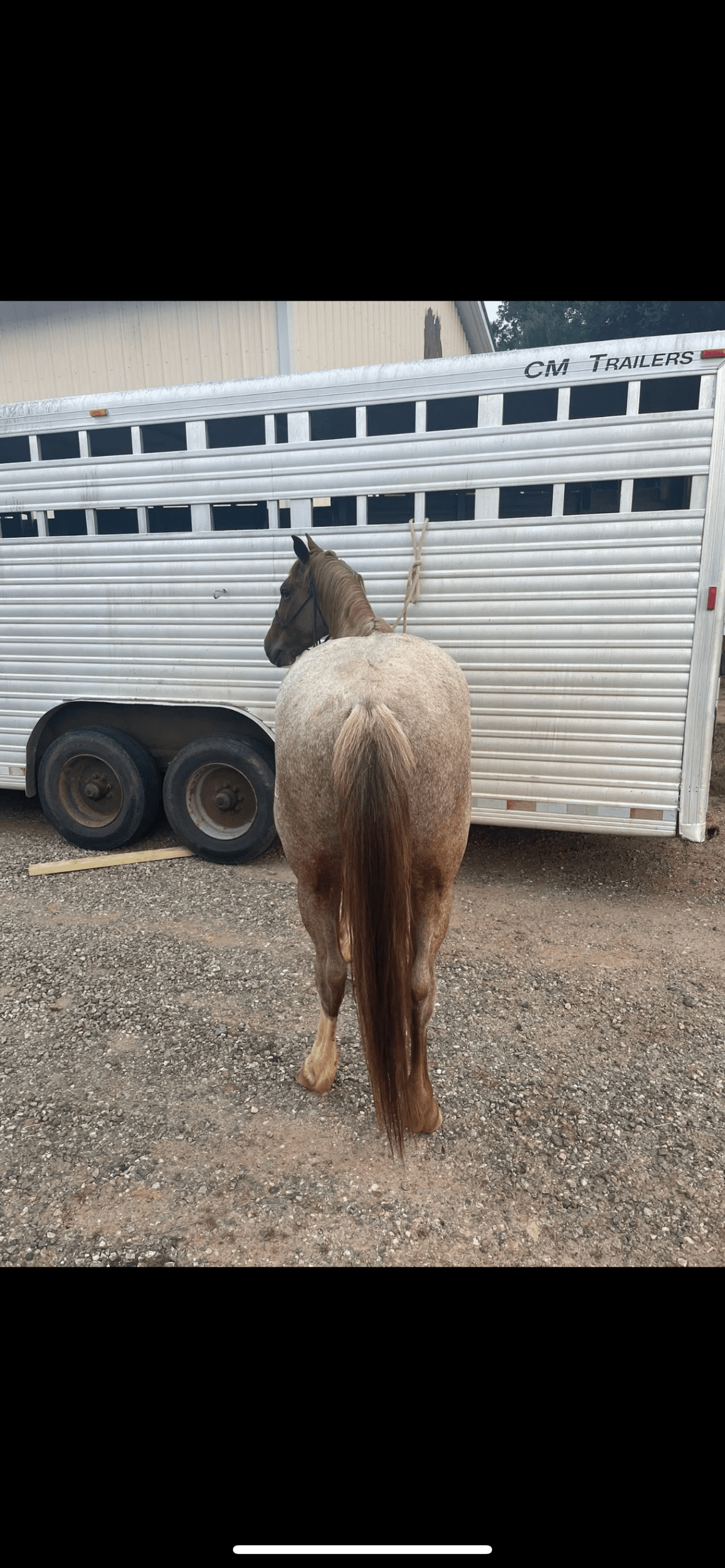 Eighty Two (82) is a 4 year old red roan cross bred gelding. Heβs been used to move , push and sort cattle. Has been trail ridden. Has been started in the roping pen.