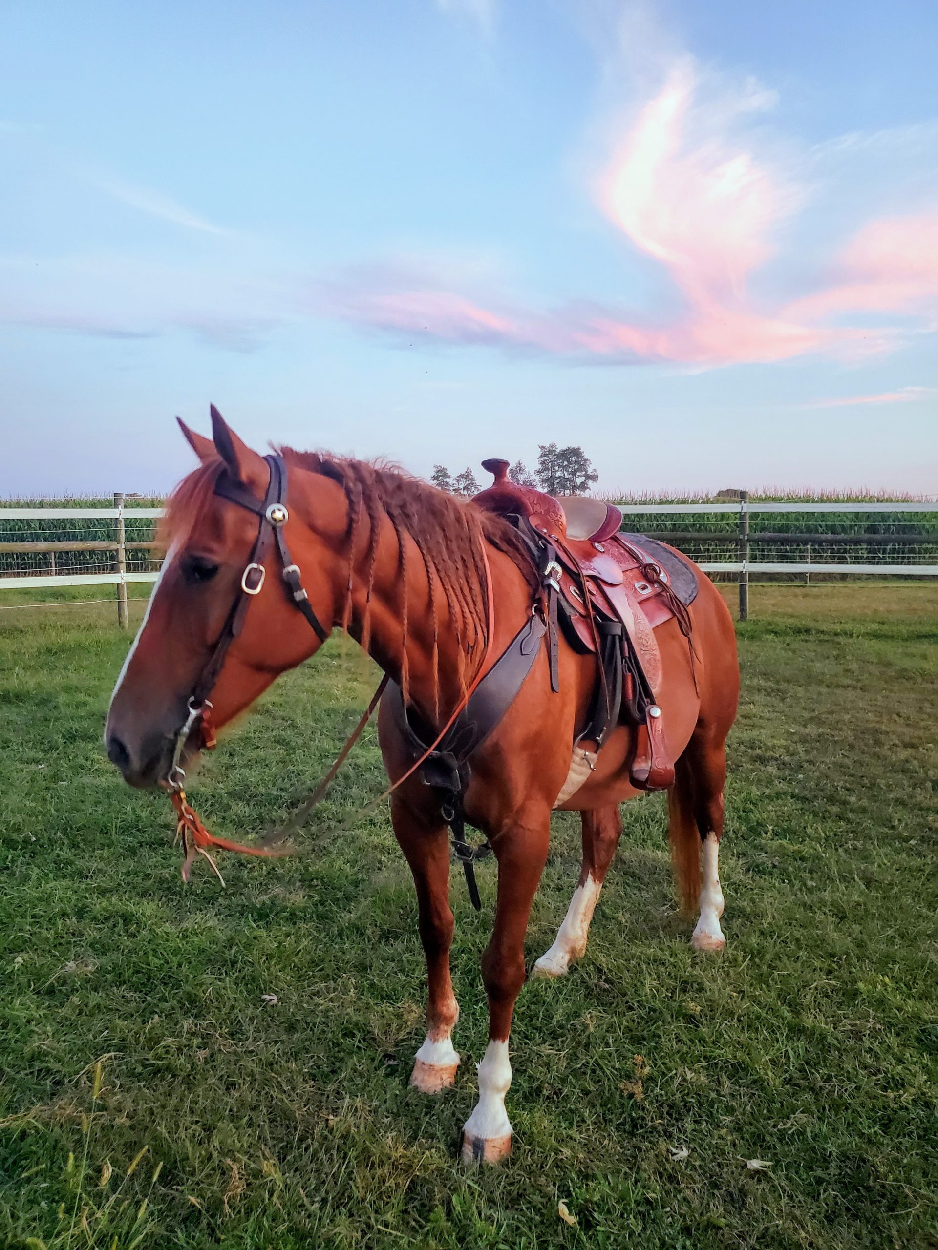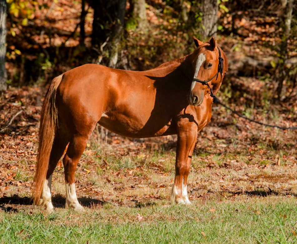 Description: 6 yr old chestnut QH/halflinger mare 100% sound Freedom is a great trail horse sure-footed and will cross creeks logs steep terrain and about anything you might find on the trail without a problem.Trailers well and stands for grooming bathing saddling and the farrier.good stall manners.No kick or buck.She has energy and loves a good run but can also walk flat-footed with the best of them.
