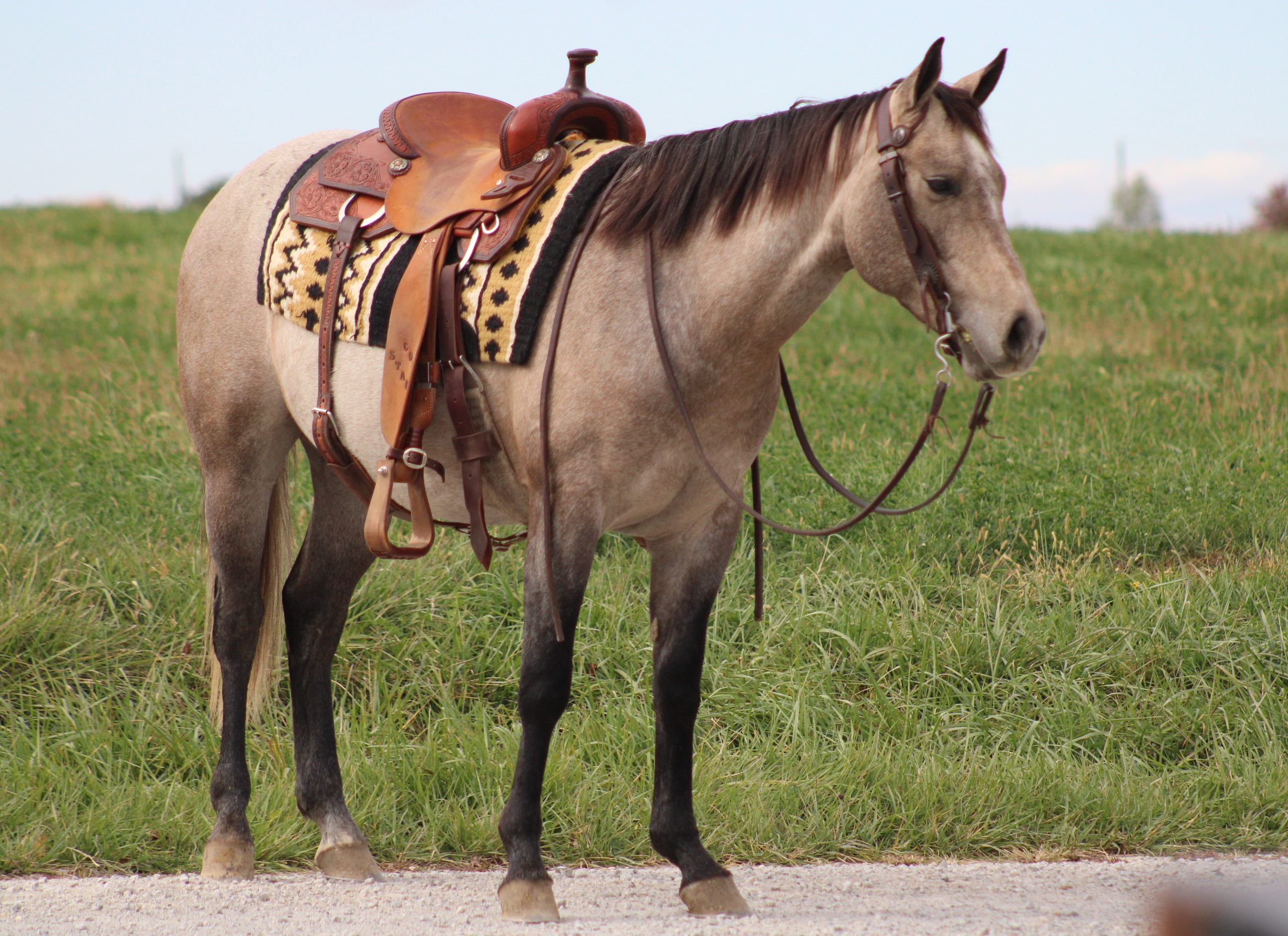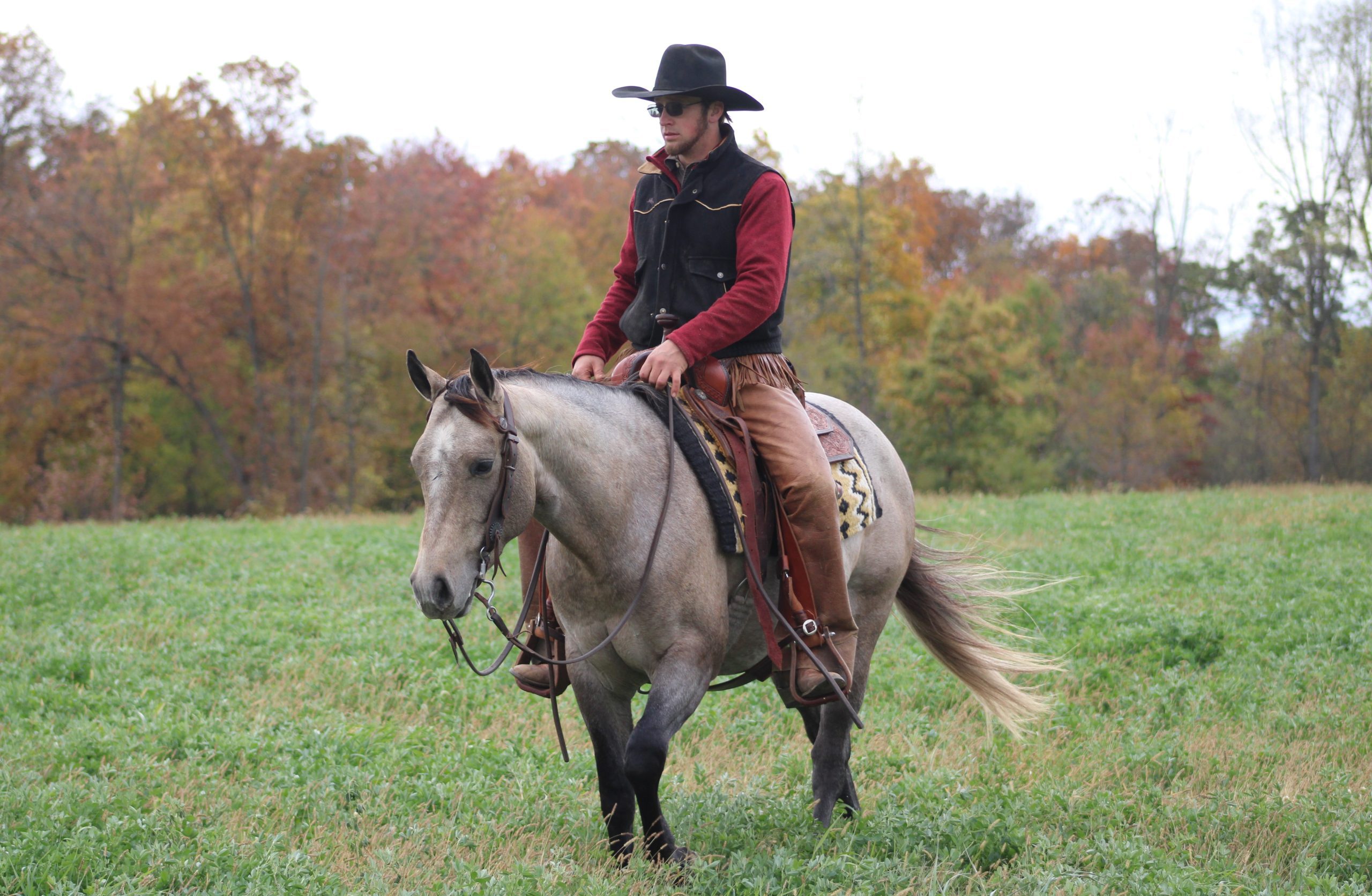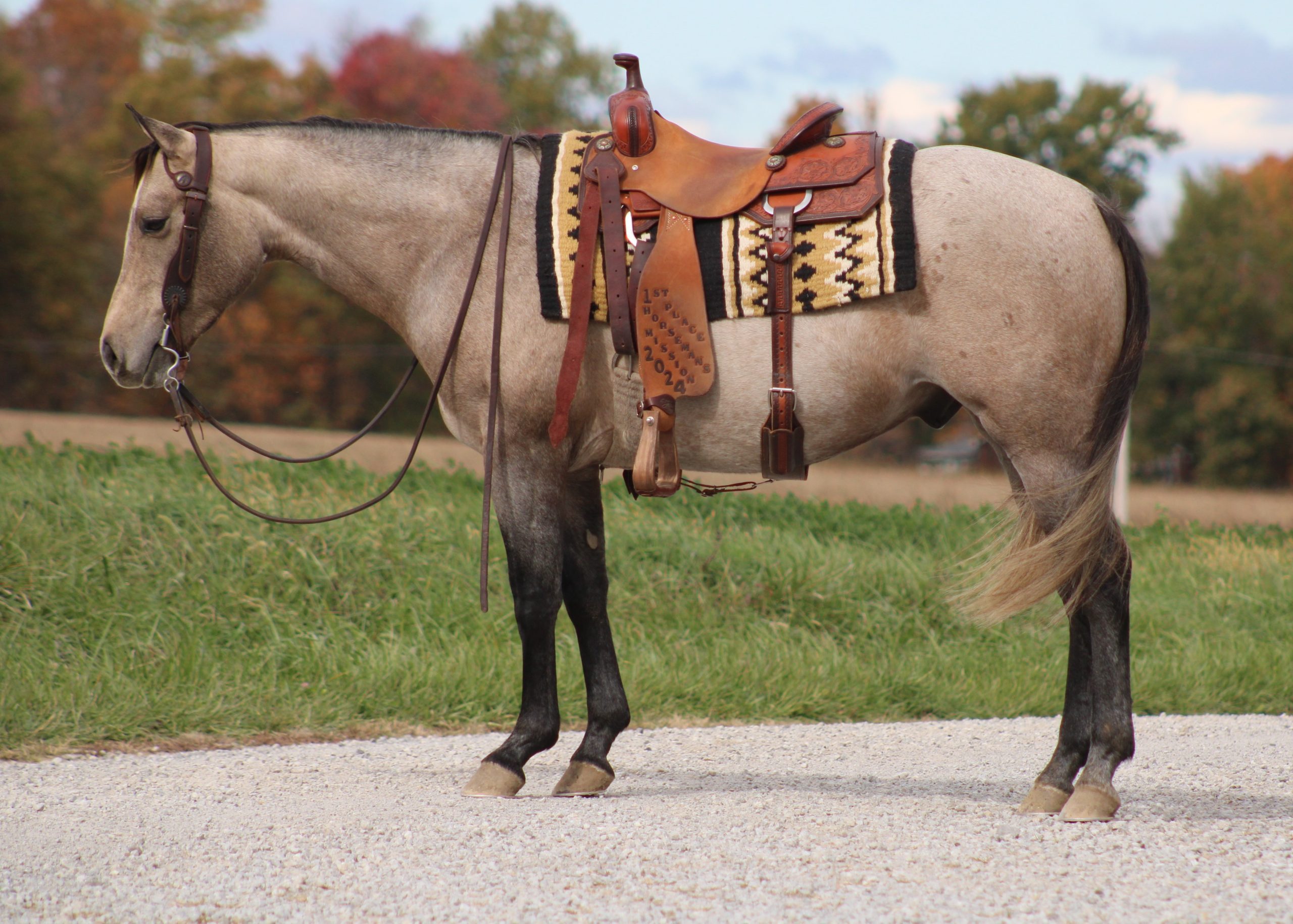 Description: Guitar's calm, friendly and willing to please attitude makes him a good fit for most anyone to get along with. He has been ridden in the arena and on the trails. He has been ridden on the road and is traffic safe. Guitar has a nice smooth walk, trot, lope transition in the arena. He knows his leads and works well of leg pressure. Guitar does all the obstacles such as walking through tires, crossing wooden bridges, through cowboy curtains, side passing over a log, and whatever else you can imagine. He is ok with cracking the bull whip and doesn't care about the tarps. Guitar is a young horse with a great start to life and is ready to go in any discipline you choose. We feel like he could do well in the ranch horse shows. Guitar also has a lot of cow sense which would also make him a great fit for roping or team sorting events. It says he is a buckskin on his papers. Guitar was registered as a buckskin when he was a baby, but he turned out to be a gray, and it did not get changed on his papers yet. Don't miss out on this nice young gelding. If you have any questions about Guitar, feel free to call Robert Mast @ 740-291-7650
