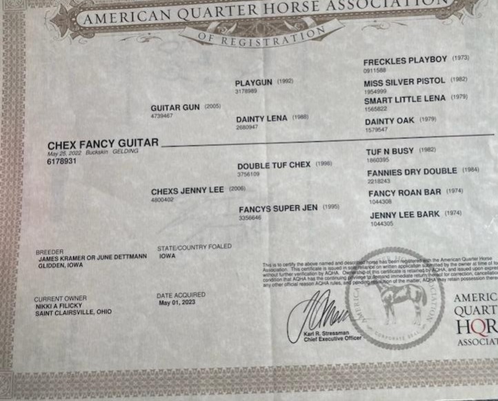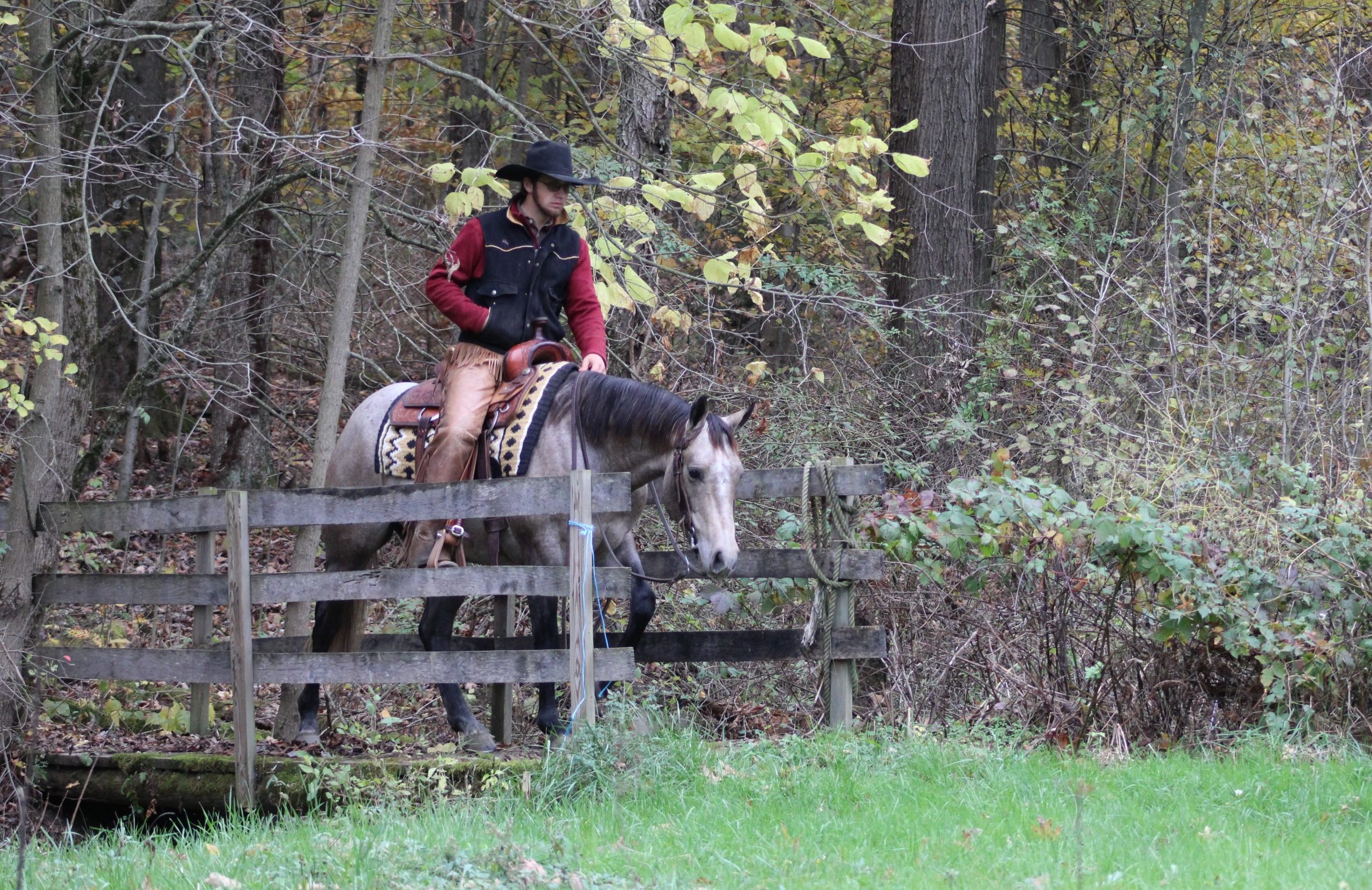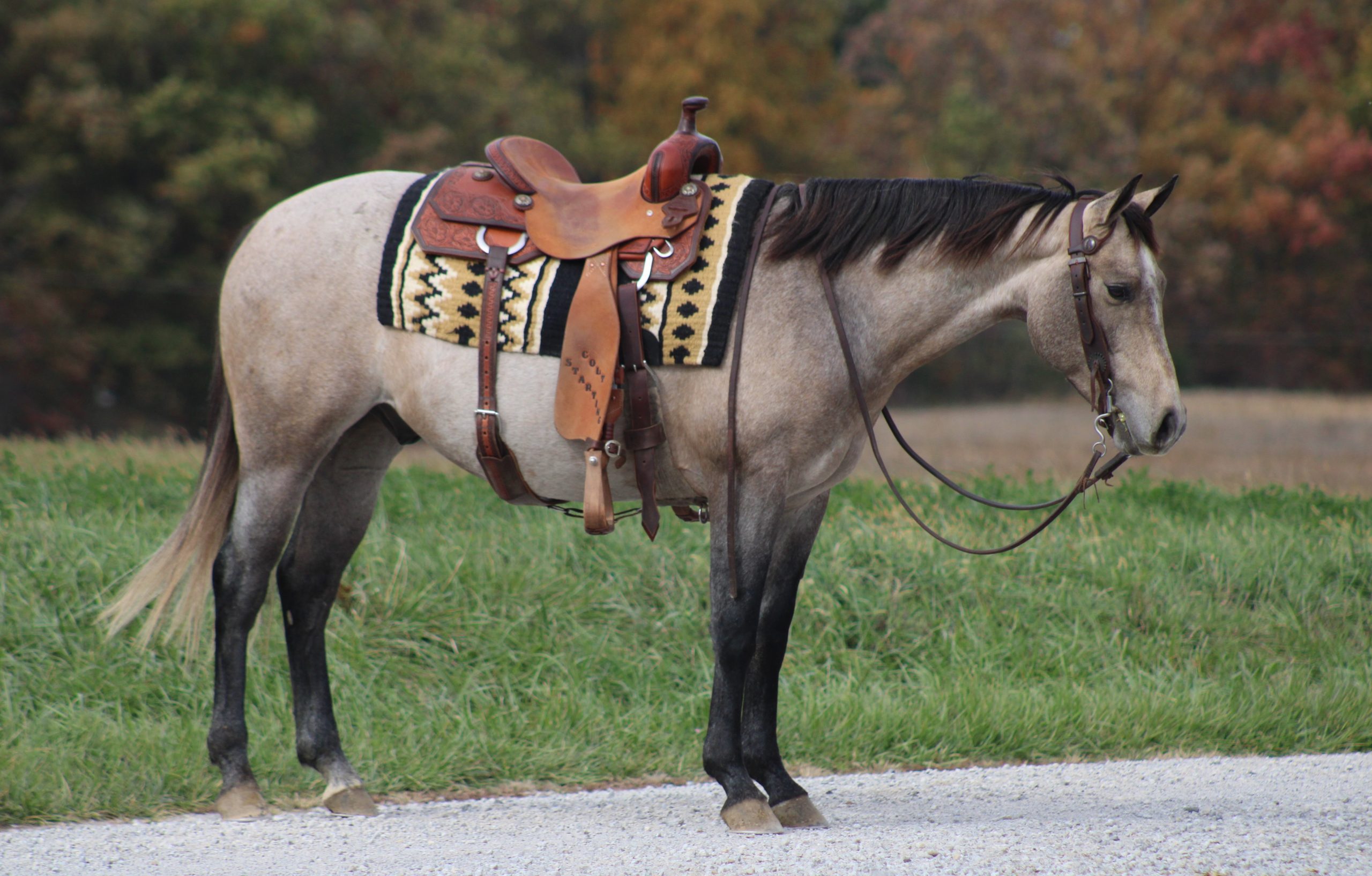 Description: Guitar's calm, friendly and willing to please attitude makes him a good fit for most anyone to get along with. He has been ridden in the arena and on the trails. He has been ridden on the road and is traffic safe. Guitar has a nice smooth walk, trot, lope transition in the arena. He knows his leads and works well of leg pressure. Guitar does all the obstacles such as walking through tires, crossing wooden bridges, through cowboy curtains, side passing over a log, and whatever else you can imagine. He is ok with cracking the bull whip and doesn't care about the tarps. Guitar is a young horse with a great start to life and is ready to go in any discipline you choose. We feel like he could do well in the ranch horse shows. Guitar also has a lot of cow sense which would also make him a great fit for roping or team sorting events. It says he is a buckskin on his papers. Guitar was registered as a buckskin when he was a baby, but he turned out to be a gray, and it did not get changed on his papers yet. Don't miss out on this nice young gelding. If you have any questions about Guitar, feel free to call Robert Mast @ 740-291-7650