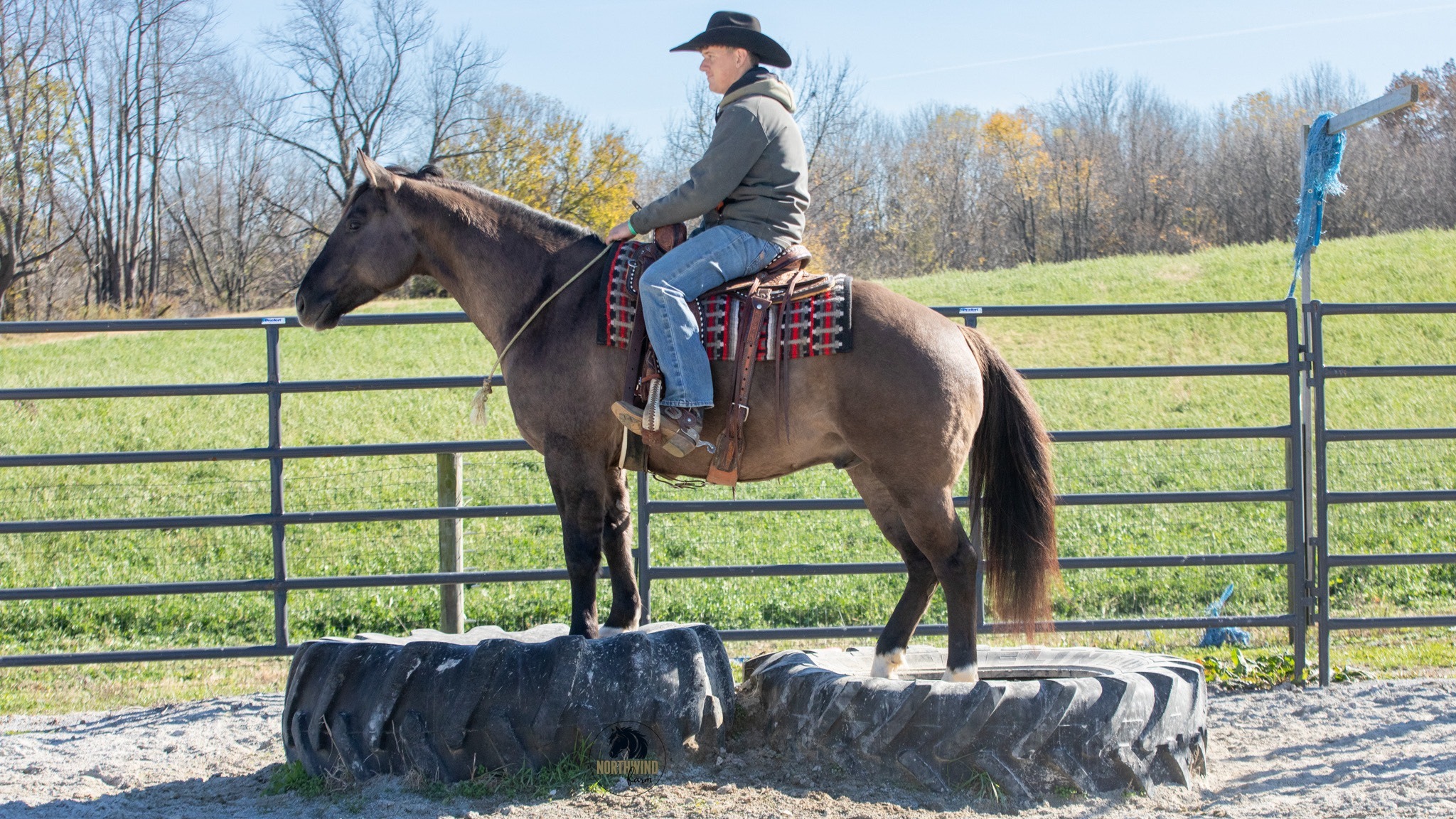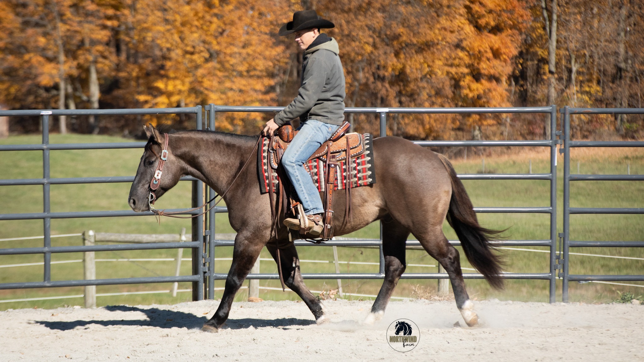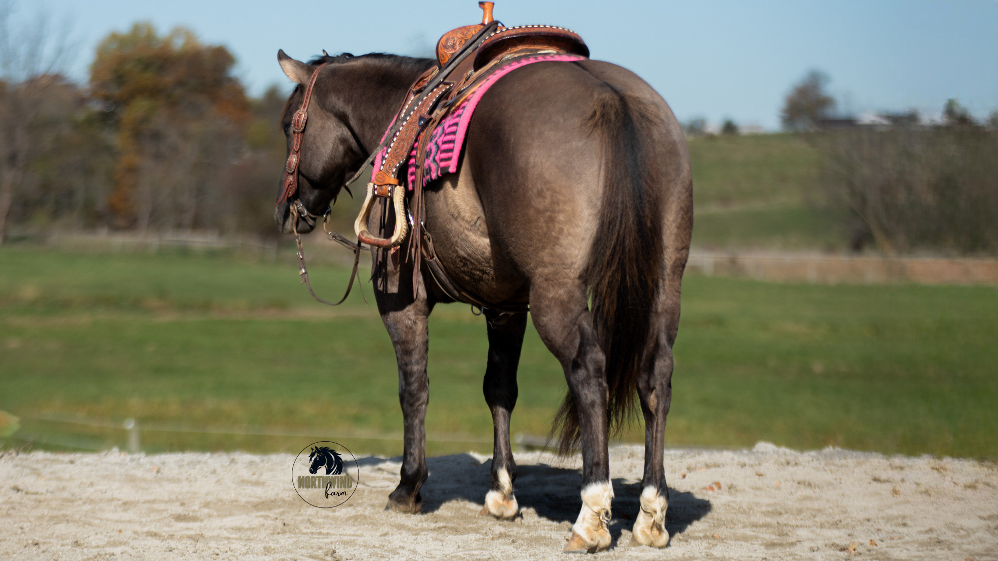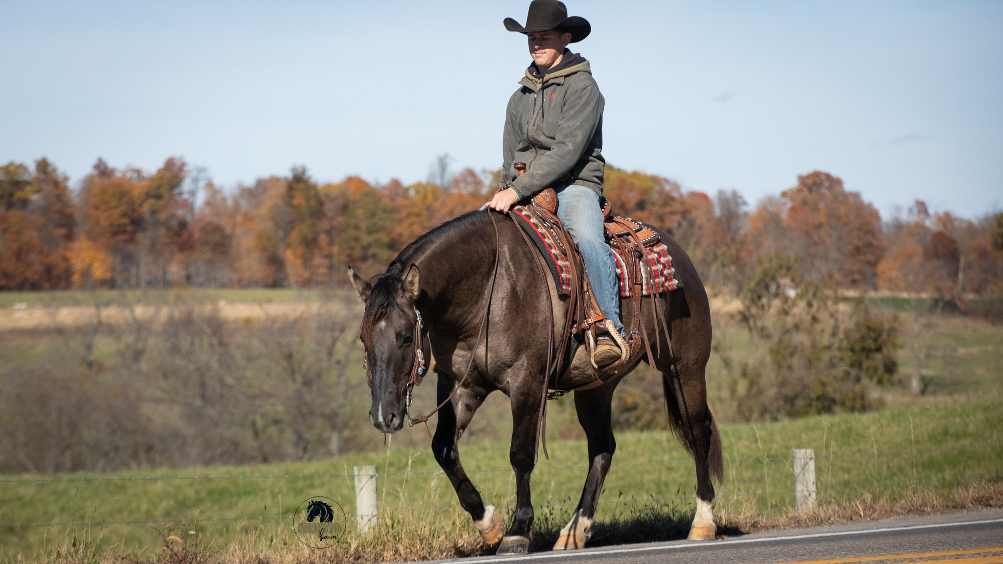 Description: Gunner is a 4 yr old grulla AQHA gelding standing at 14.3hh. Gunner is well broke to ride! He rides great in the arena and out on the trails. He will pick up both leads, he stops nicely and has a good back up. He will neck rein and move off of leg pressure! He has a slow pivot and an easy side pass. He will go through all the obstacles with no issues. He doesn’t mind the tarps or the ball. He is confident out on the trails! He has been around farm equipment and dogs. Gunner is a very fun horse to ride! He is 100% sound! Contac Lisa: 330-473-3521