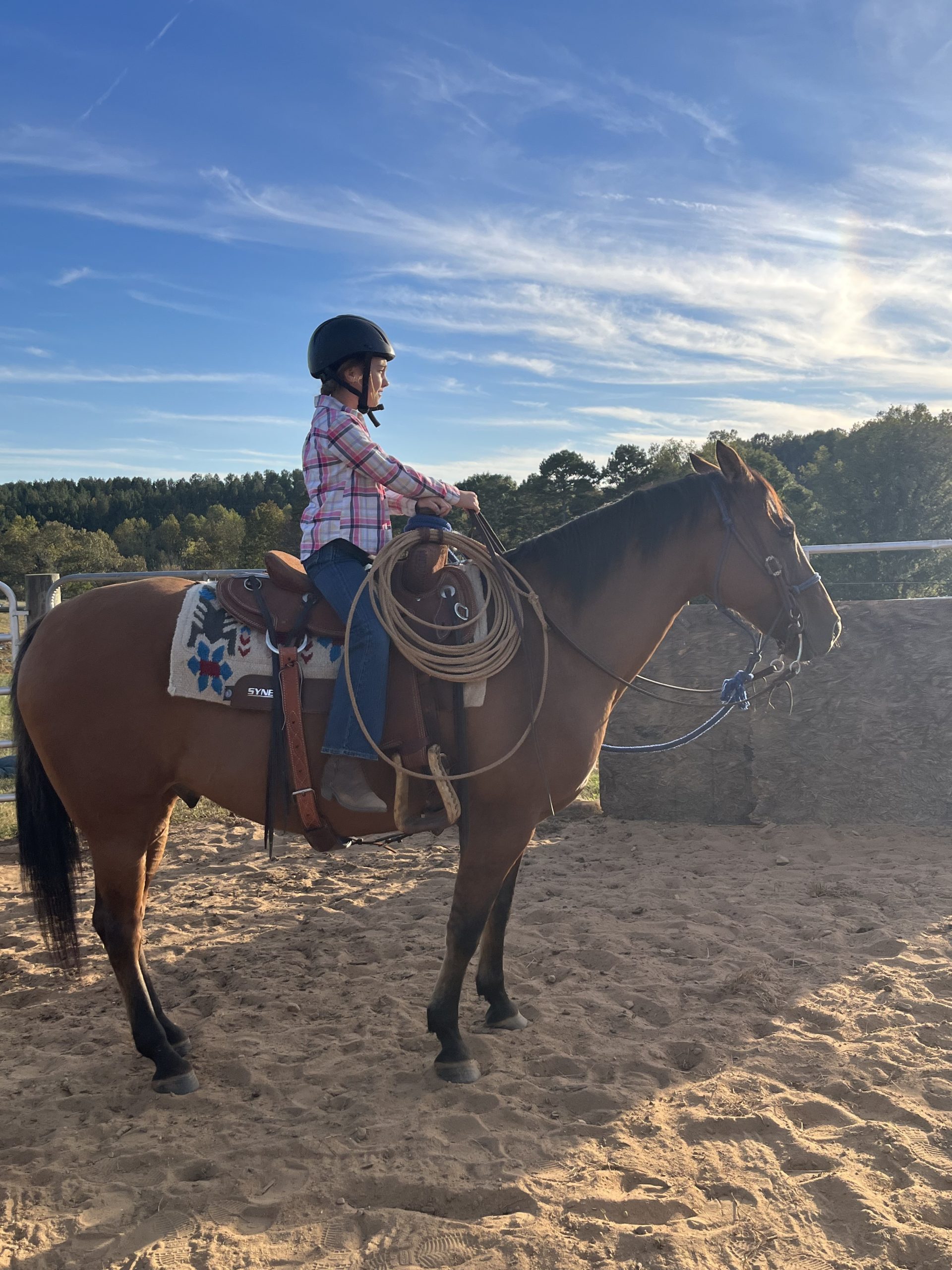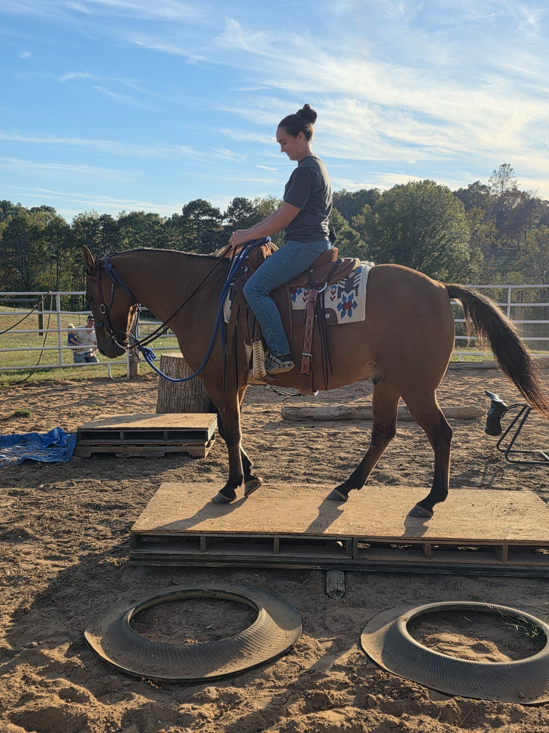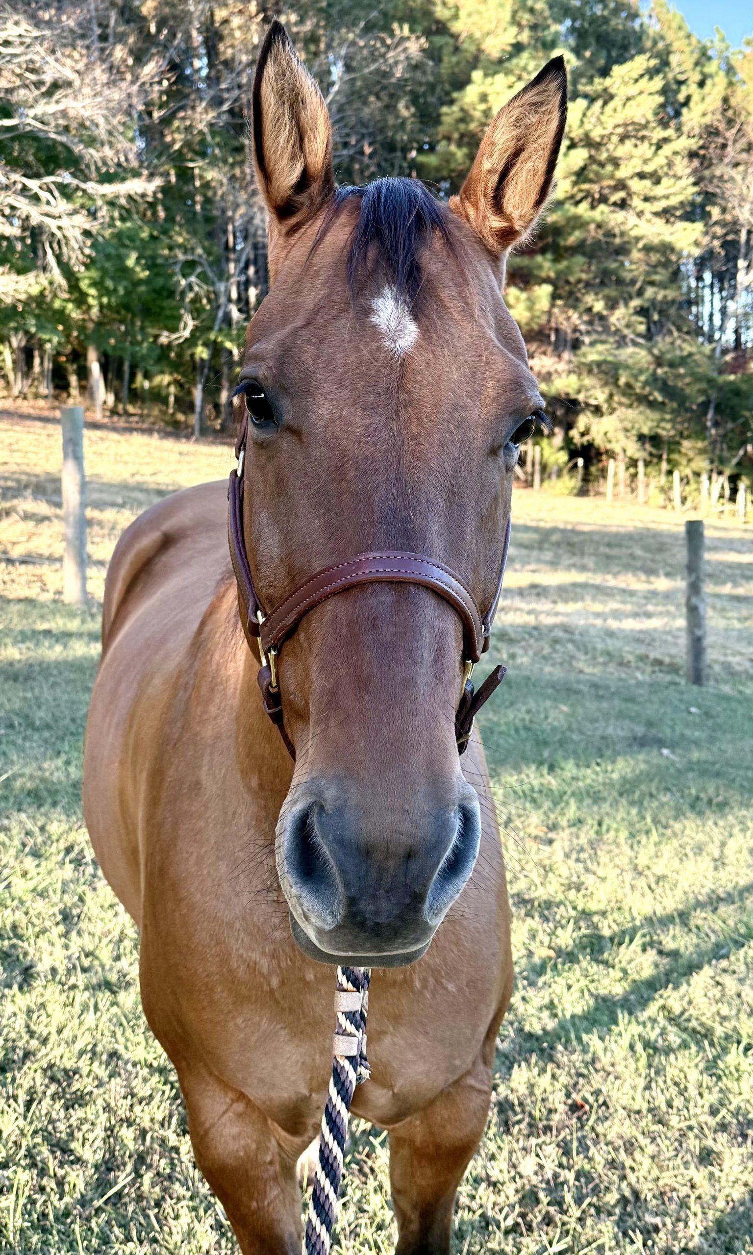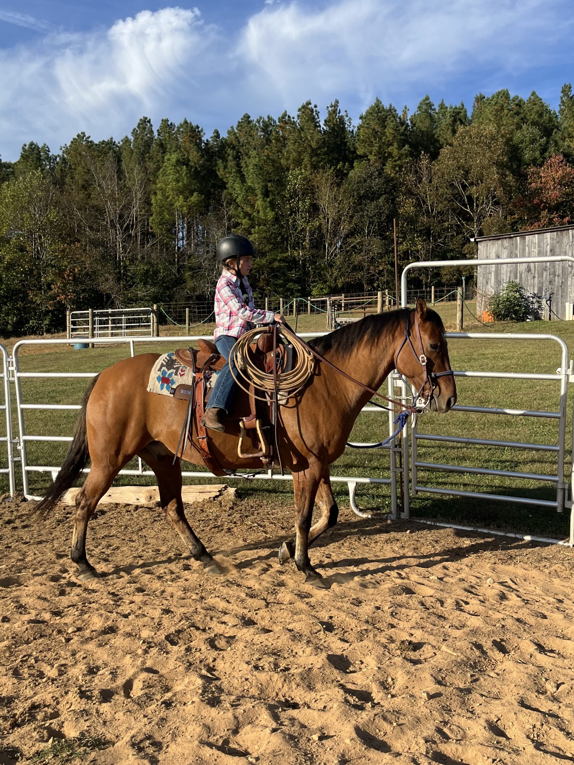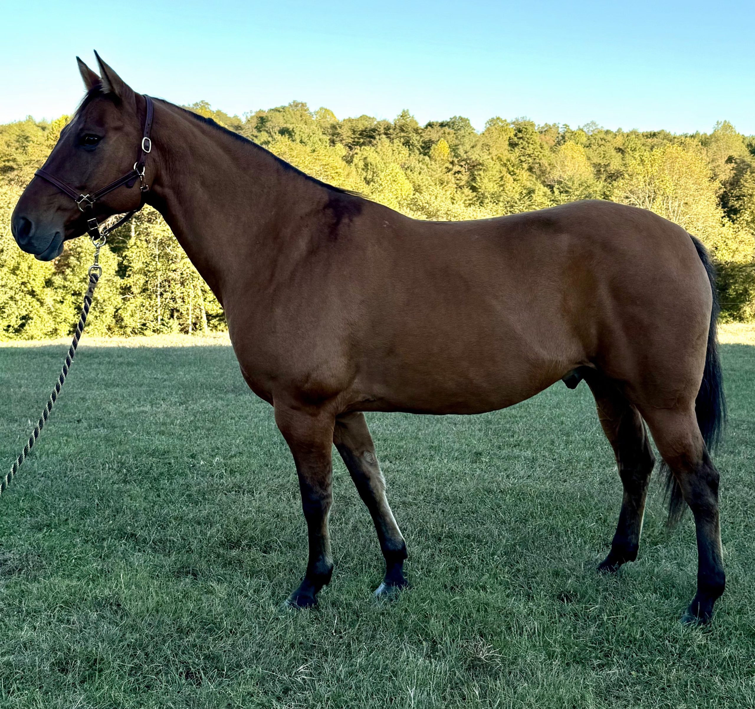 Description: 8-year-old quarter horse gelding, bay, 14.1 hands. Gentle, smart, and versatile, perfect for families, trail riding, or ranch work. Has had experience around cows, and started some roping on him, crosses water, and responds to cues quickly. Calm, reliable, great with kids and other horses. Bridle and ride anytime, easy to pick back up after time off.