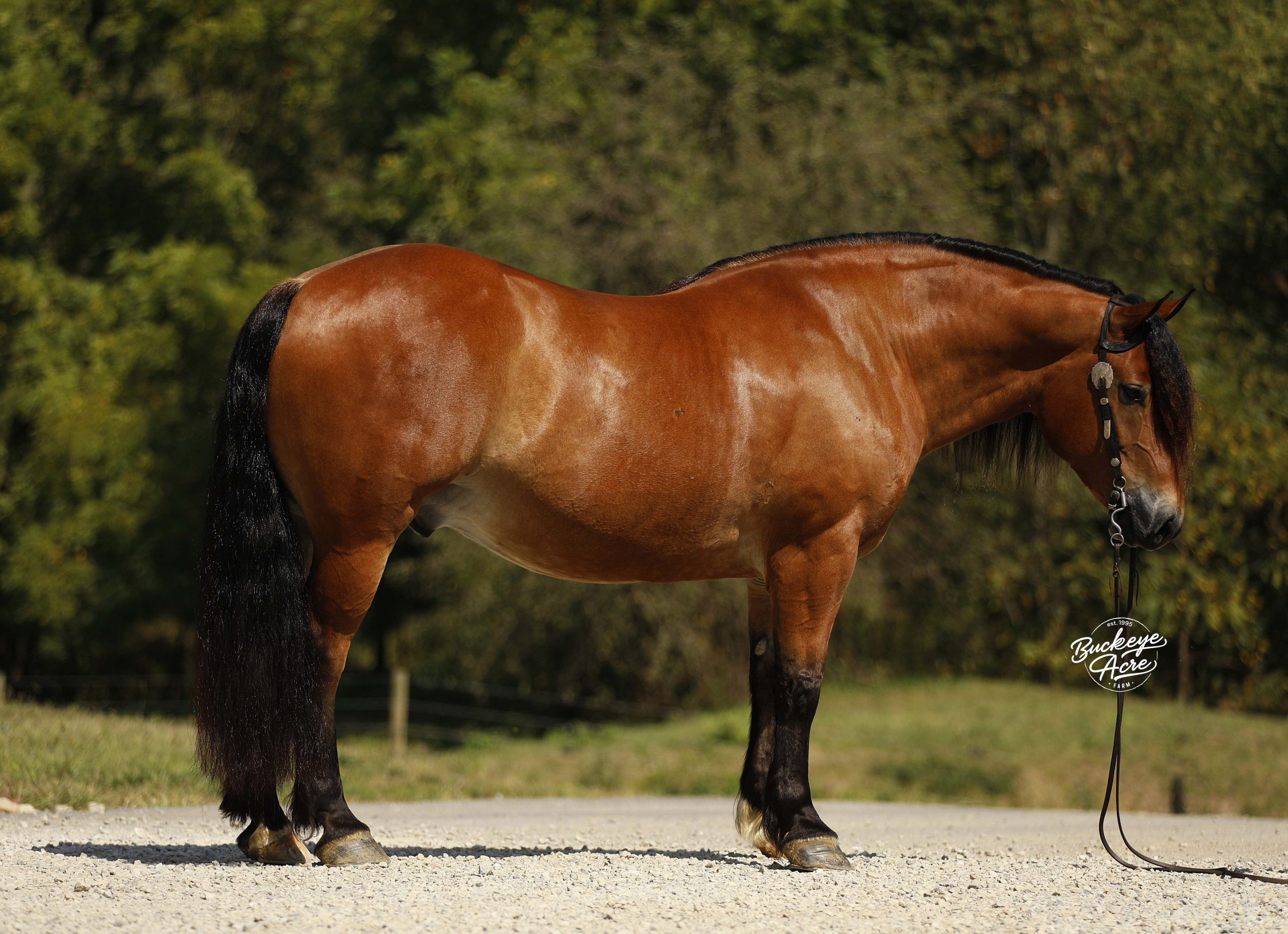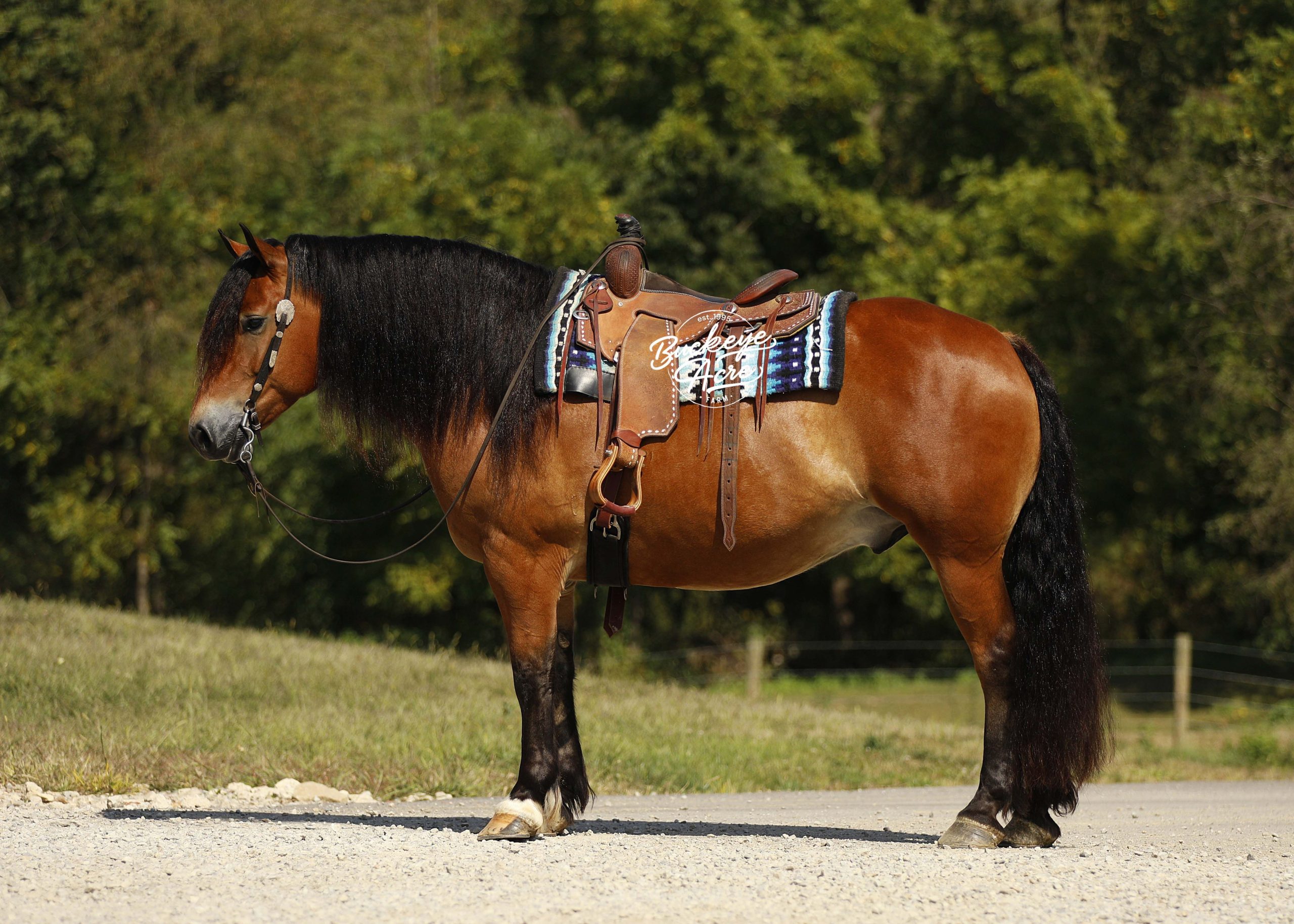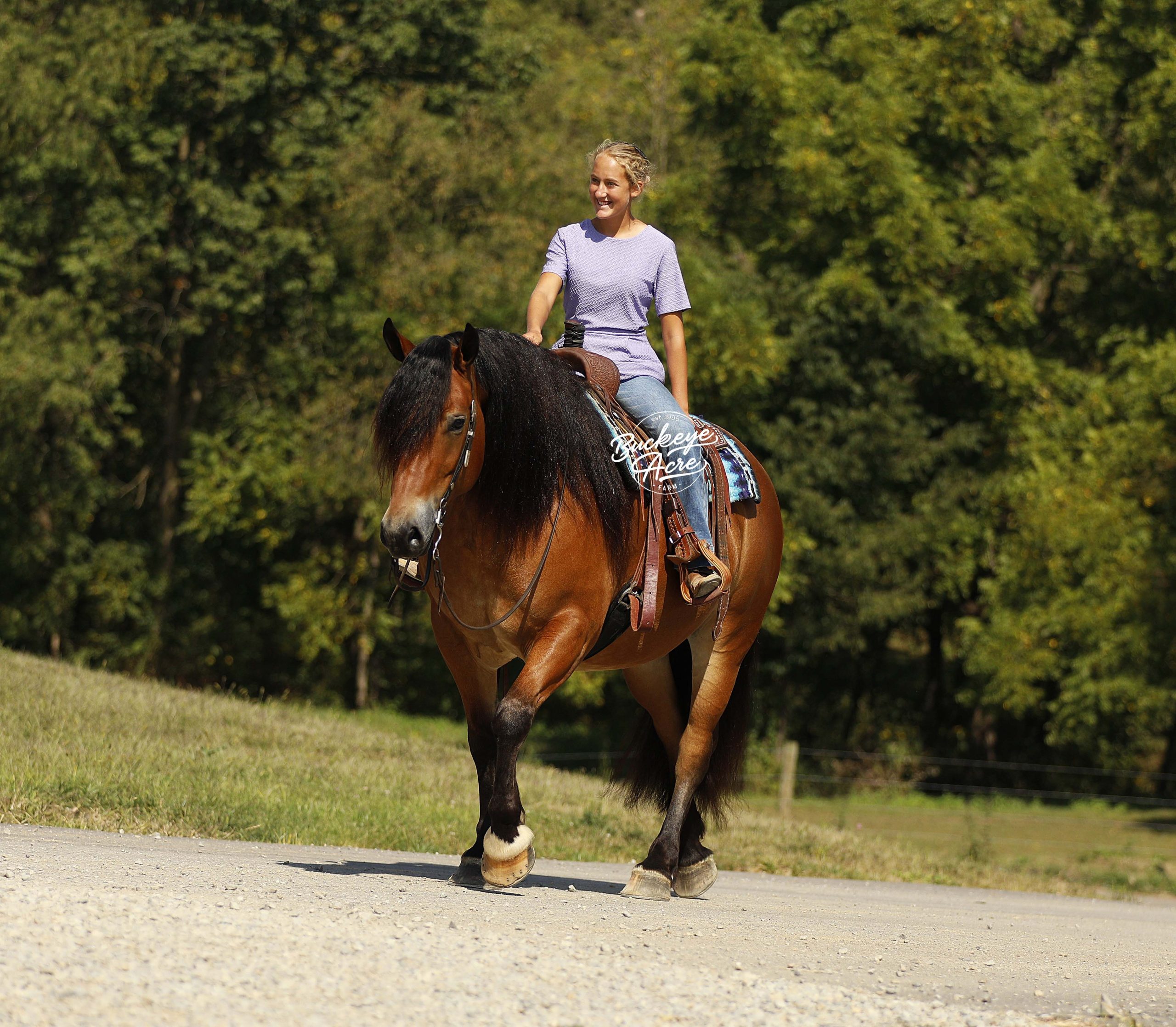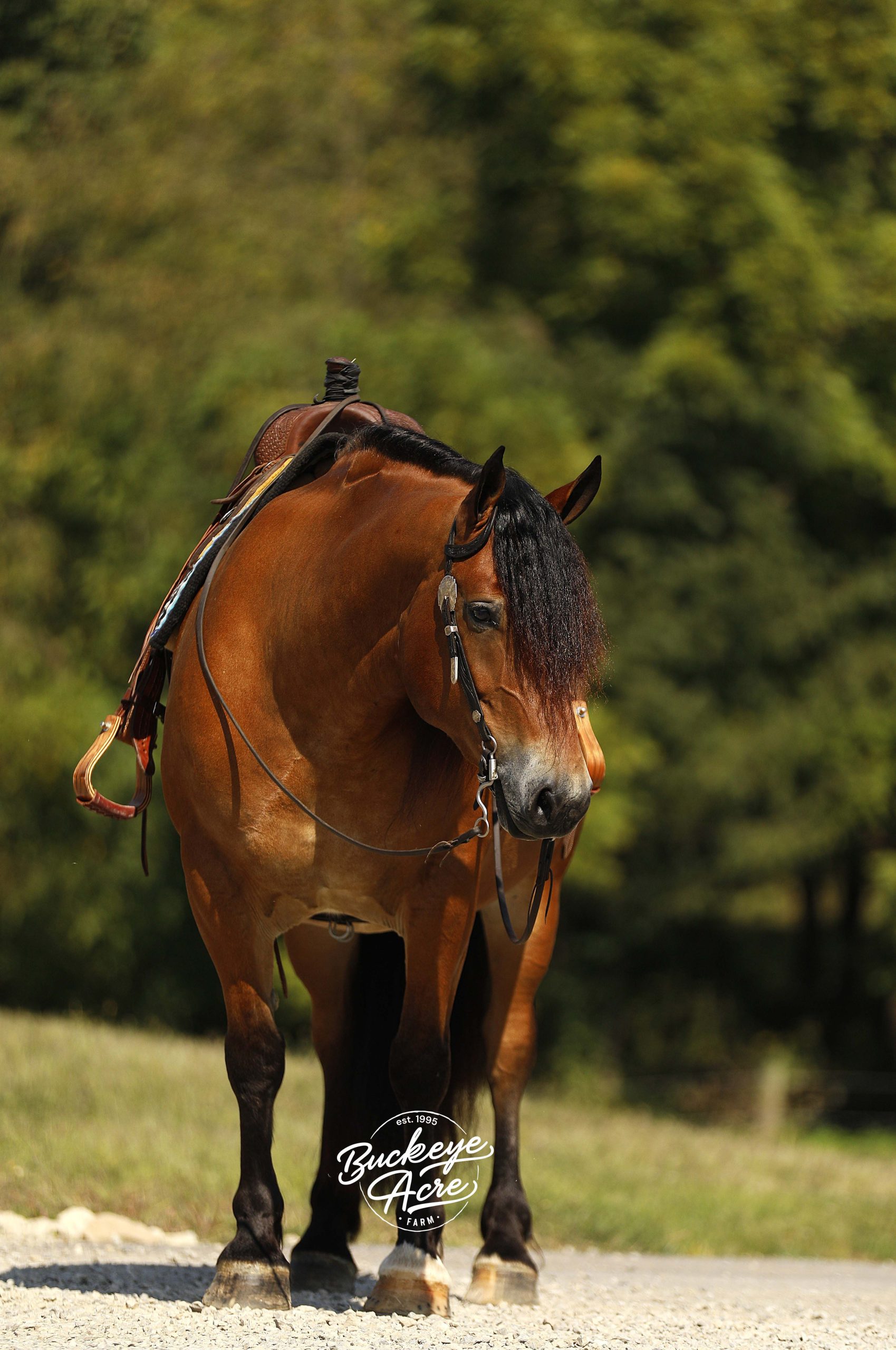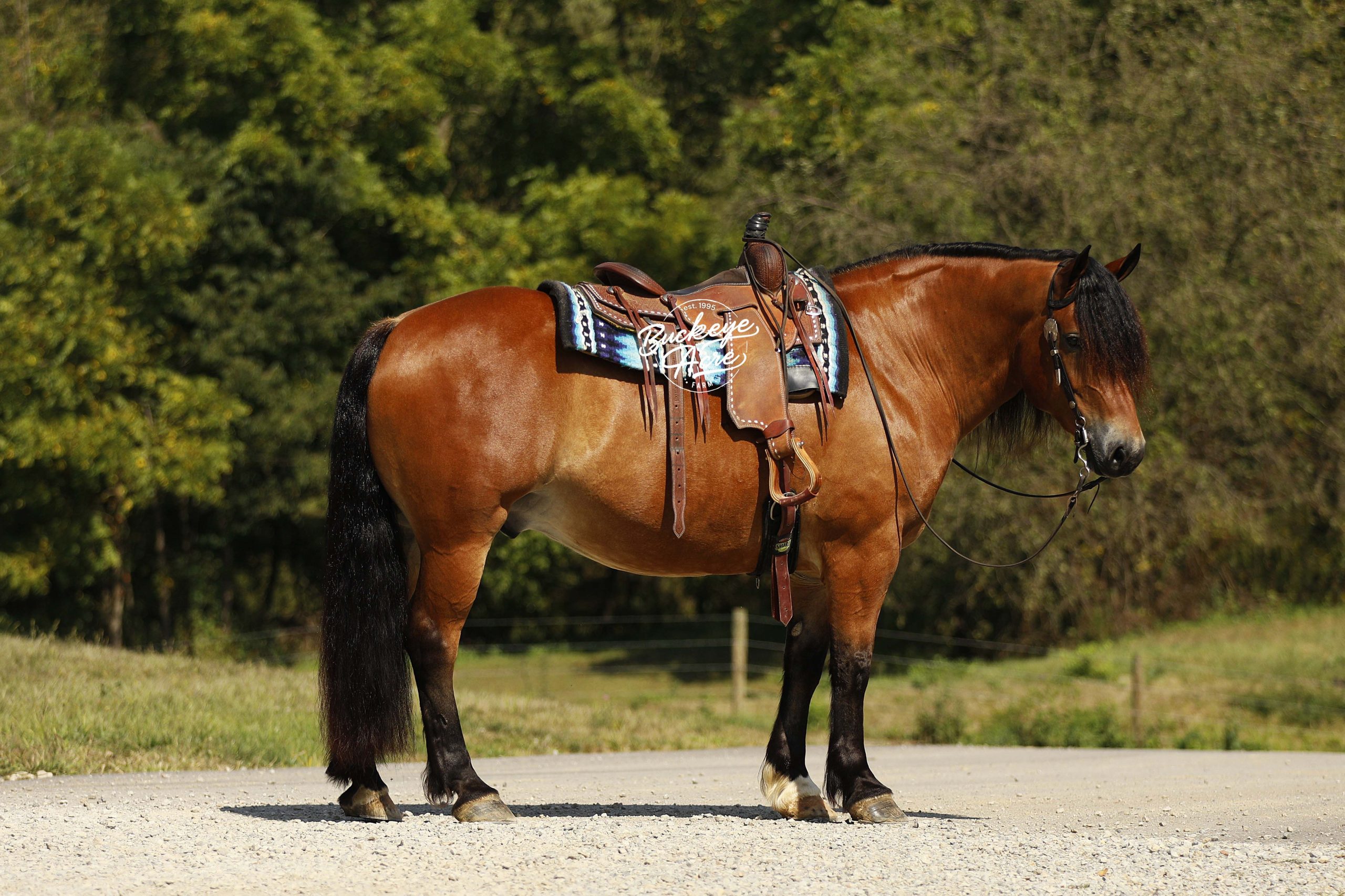 Description: Mission is a stunning 2018 model bay draft cross gelding standing a solid 15.2 hands. With his muscular build, striking black socks, thick bushy tail, and strong topline, he has the look everyone is searching for. Out on the trail, Mission is steady and dependable—whether you’re riding uphill, downhill, through creeks and water, stepping over downed logs, or making your way across rocky ground. He has been ridden Western, English, and bareback, and has plenty of miles under saddle both in the arena and out on the trails. He carries three very good gaits, knows his leads, and rides with a smooth one-handed neck rein. He is also confident with tarps, whips, and jugs, taking everything in stride. In the barn, Mission is a true puppy dog. From his stall to the pasture, he loves attention and will soak up every scratch you’re willing to give. With a bright, kind eye and a sweet personality, he’s the kind of horse that makes spending time with him just as enjoyable as riding. He is up to date on worming and dental care and is ready for his next chapter. Please note that in some circumstances he is not motor vehicle safe, so we do not recommend him for heavy road riding. If you think Mission could be the one you’ve been looking for, please feel free to reach out to Duane at 330-231-2324 for more information.
