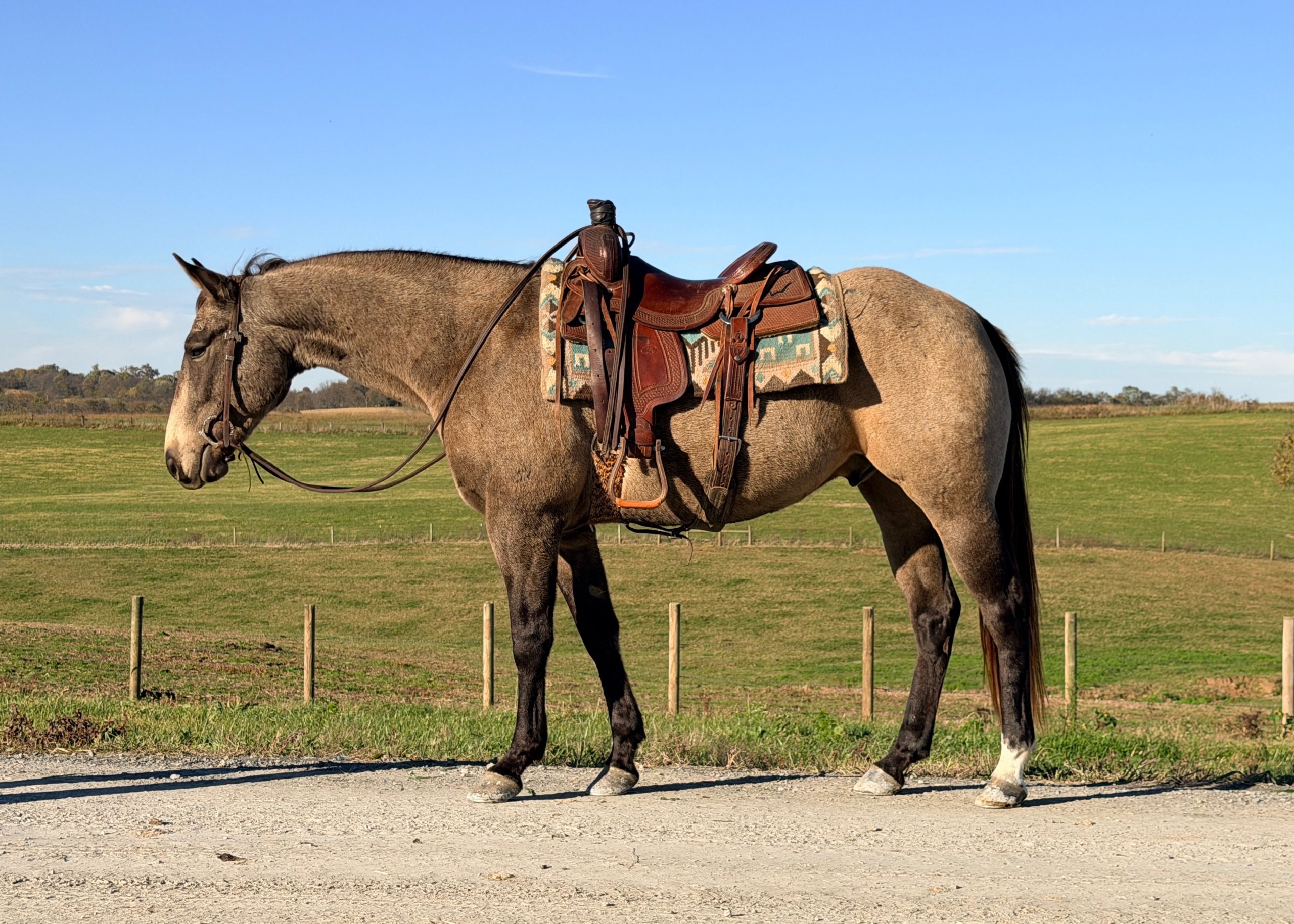 Description: Mack’s Smoken Joe, affectionately known as muley is our barn favorite! You name a job, and muley is there to do it. For 4 years of his life, he has worked in the Albany stockyards every week. He pushes cattle, loads trucks, and sorts as needed. You can open and close gates on him easily. Outside, you can rope and doctor cattle as needed. He handles the rope well and doesn’t get worked up in sticky situations. Muley walks, jogs, and lopes nicely. He neck reins, side passes, and is an overall pleasure to ride. You can relax and enjoy a nice trail ride on him as well. Muley is confident to ride out alone or with a group. We have taught beginner lessons on him as well. To top it all off, Muley is also trained to drive to the wagon single and double. He really is the whole package! He is easy to catch, ties nicely, easy to shoe and bathe, and gets along well in a mixed herd of mares and geldings. Muley is an exceptional gelding that has been in great care his entire life. You won’t want to miss him! For more information, call/text Sammi at 704.798.5497