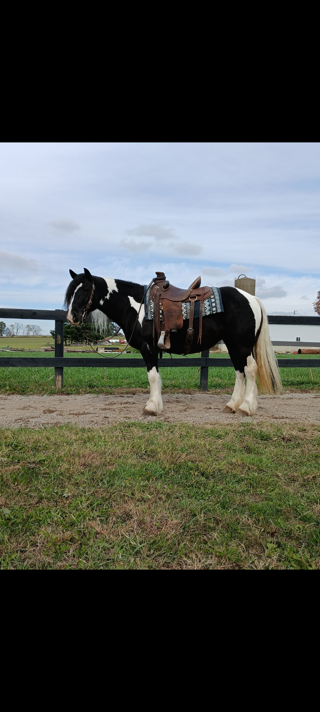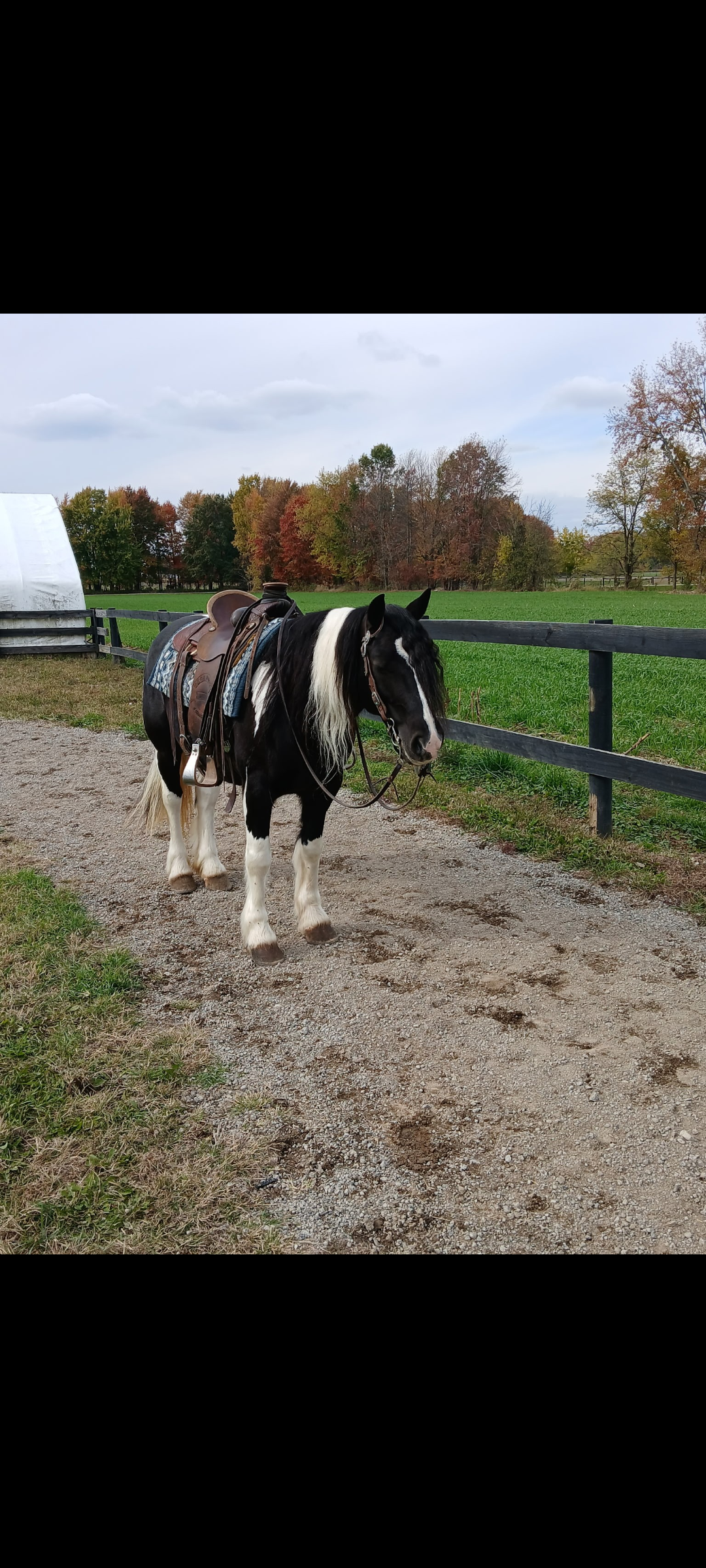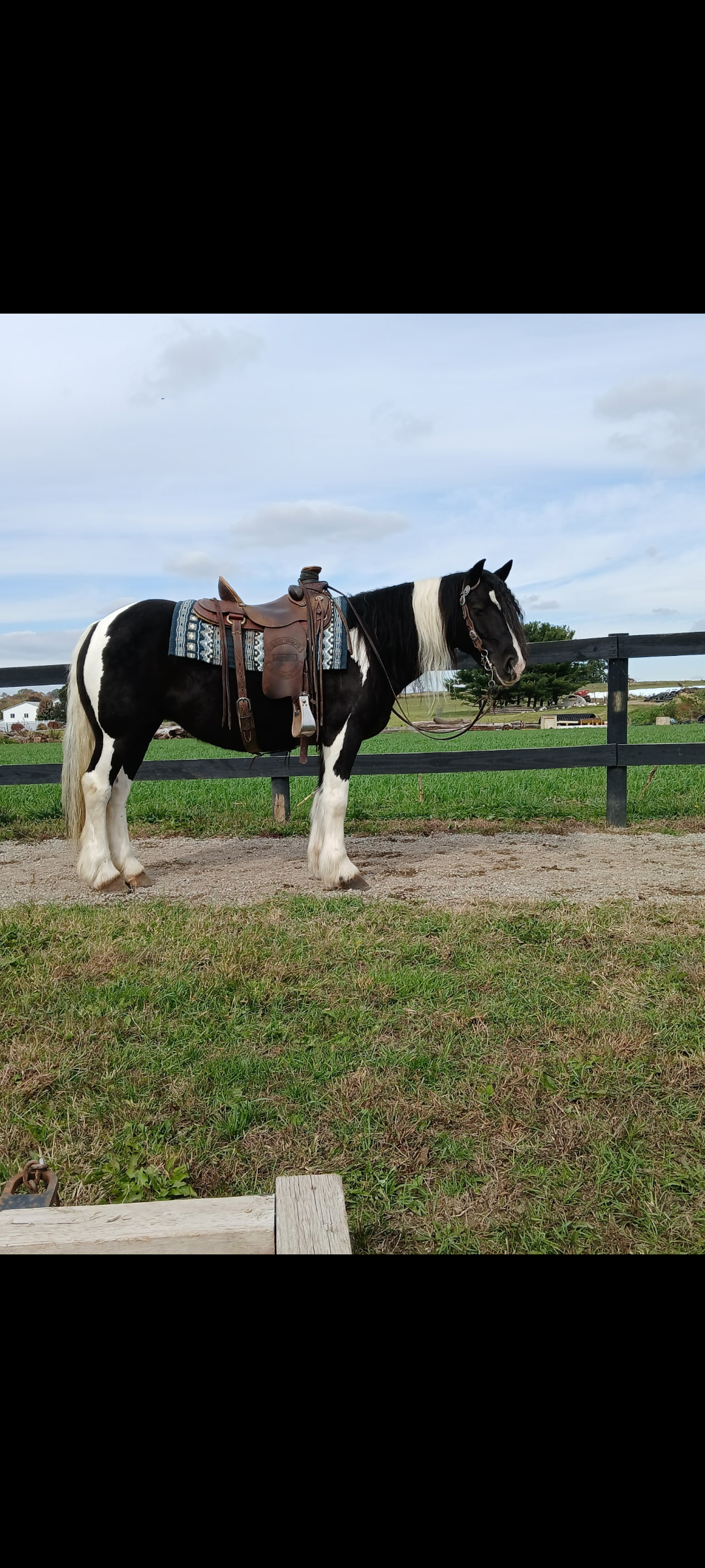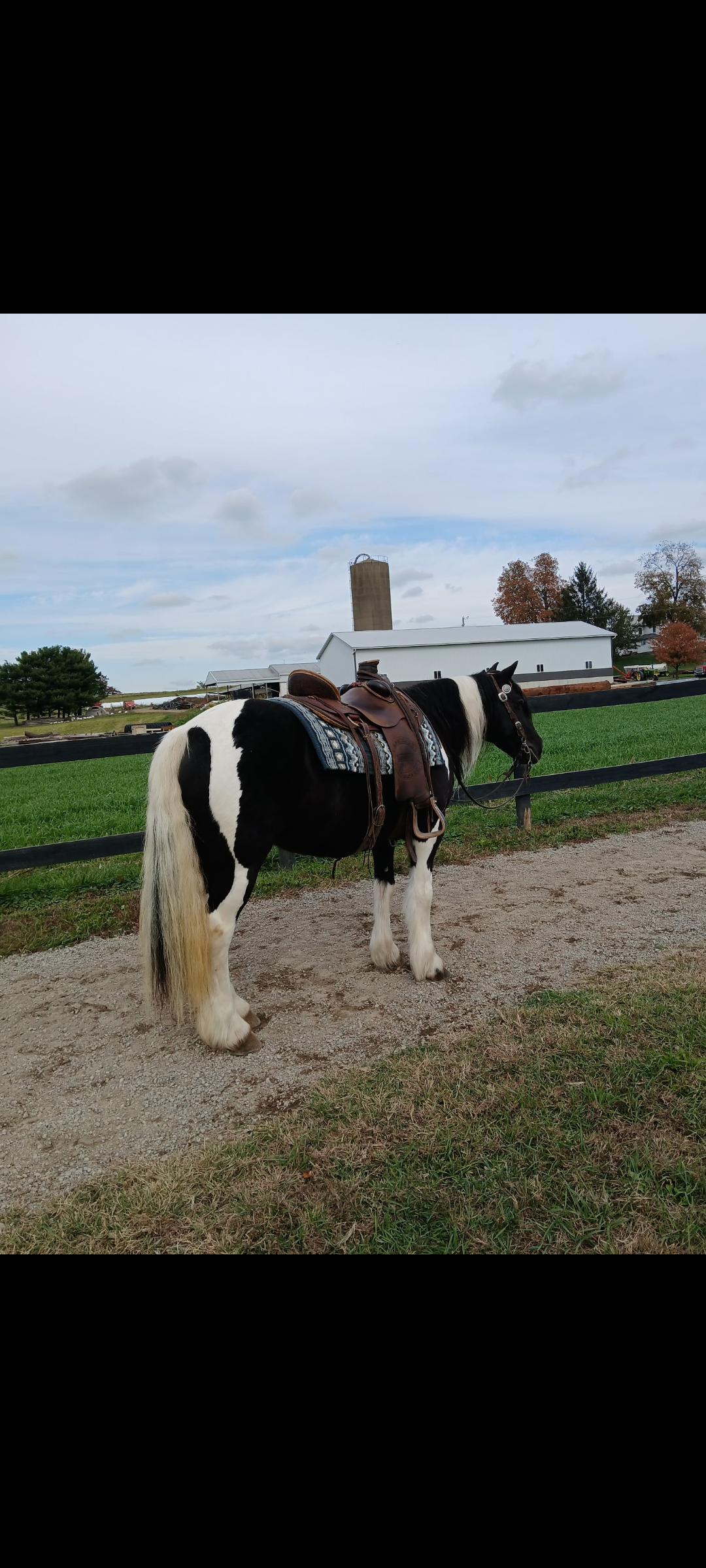 Description: 9 yr. Old IGEA Registered tobiana gypsy vanner mare. 14.2HH Pearl is kid safe to ride has been on trails on the road an in the arena a lot. Pearl will cross water logs an most any obstacle with ease. She will walk trot canter pick up both leads an responds to leg cues Pearl is quiet in the barn good with kids an loves attention she is safe for any level rider an will sell 100 percent sound no vices!! Call or text 330-466-8641