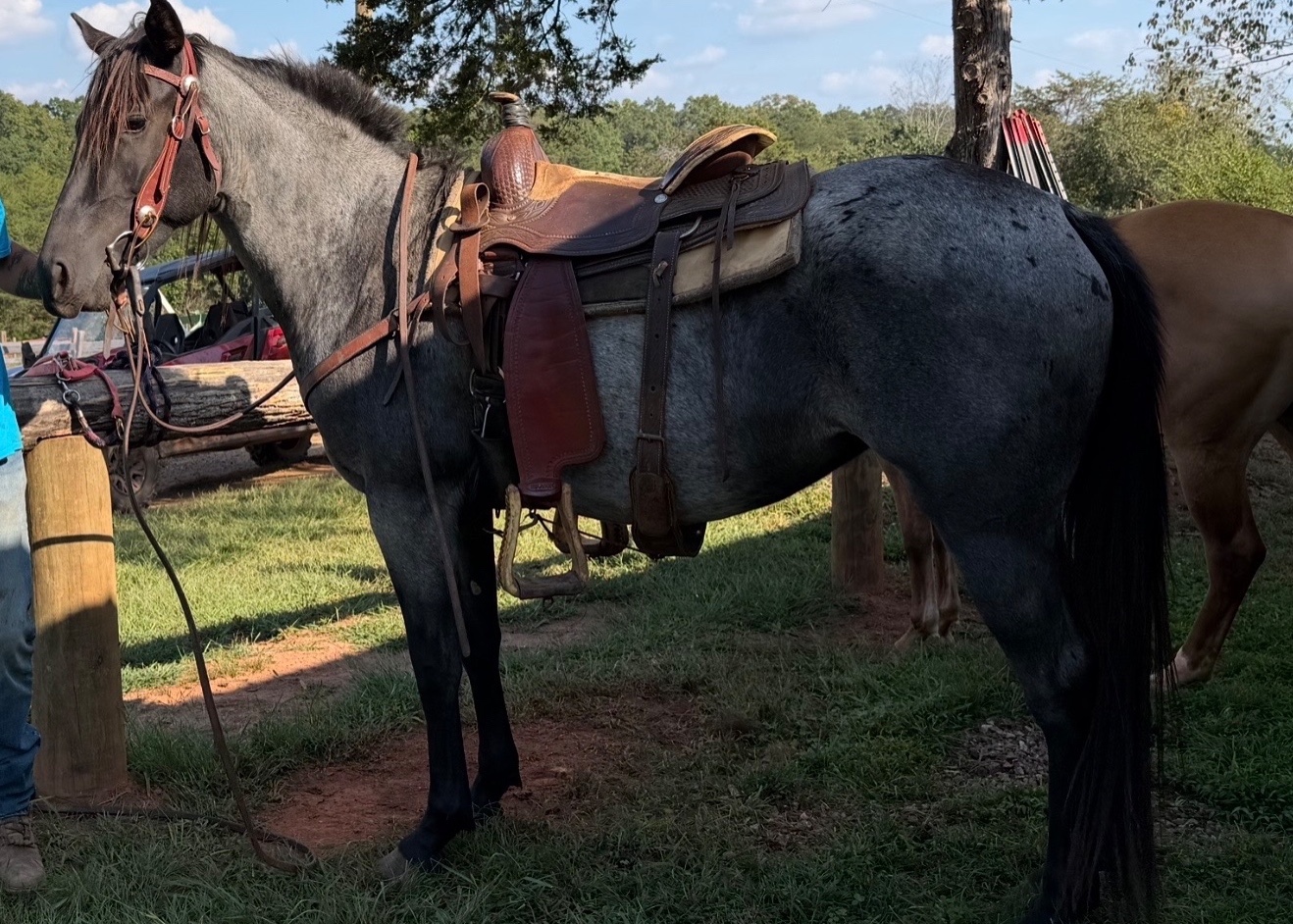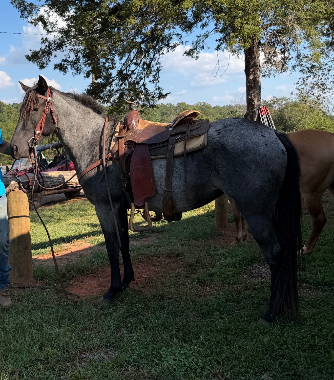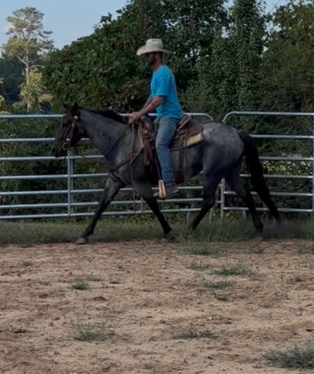 Description: Registered AQHA blue roan mare. Great all-around horse with a great mind. She has been started and is ready to finish in any direction you’d like to take her.