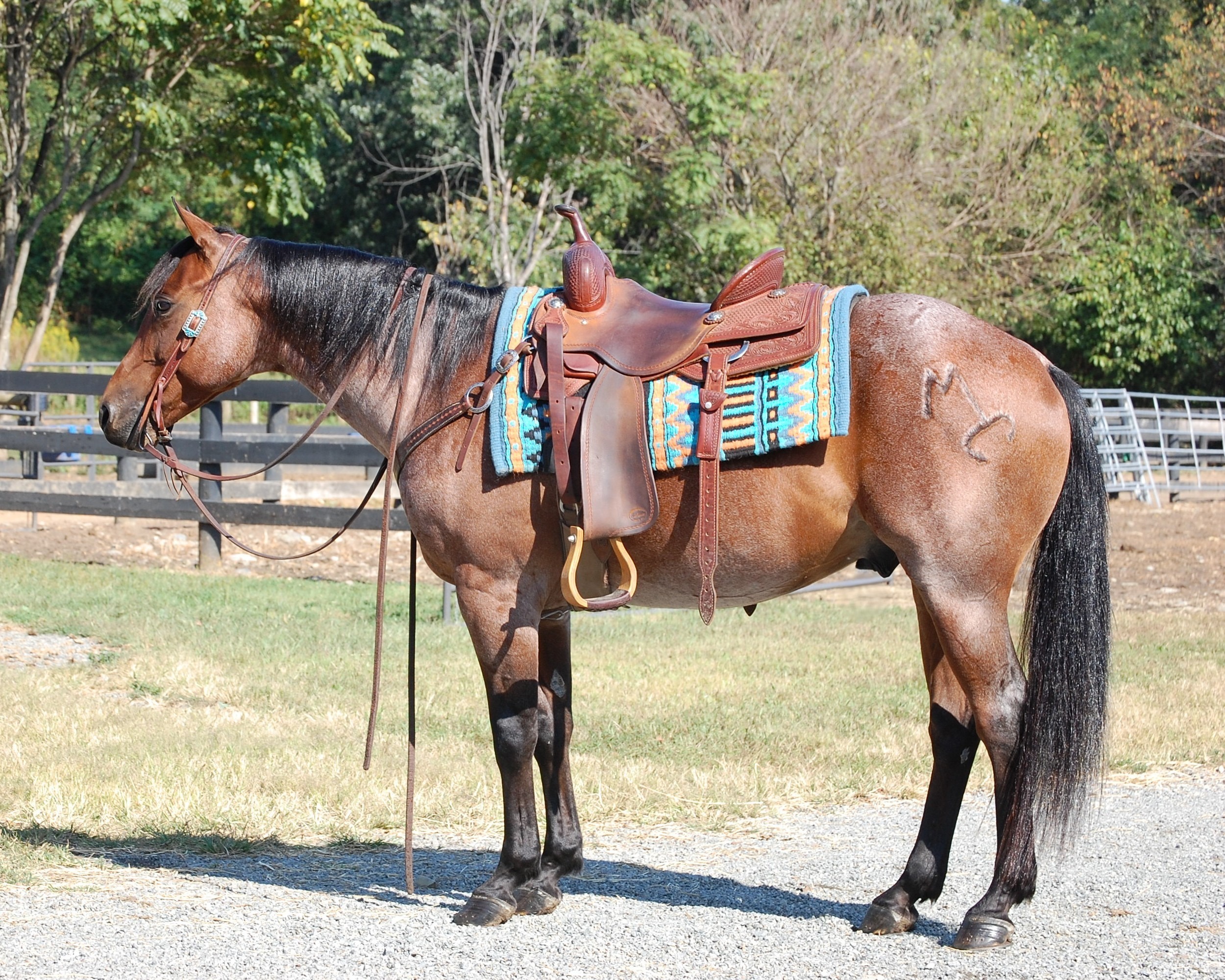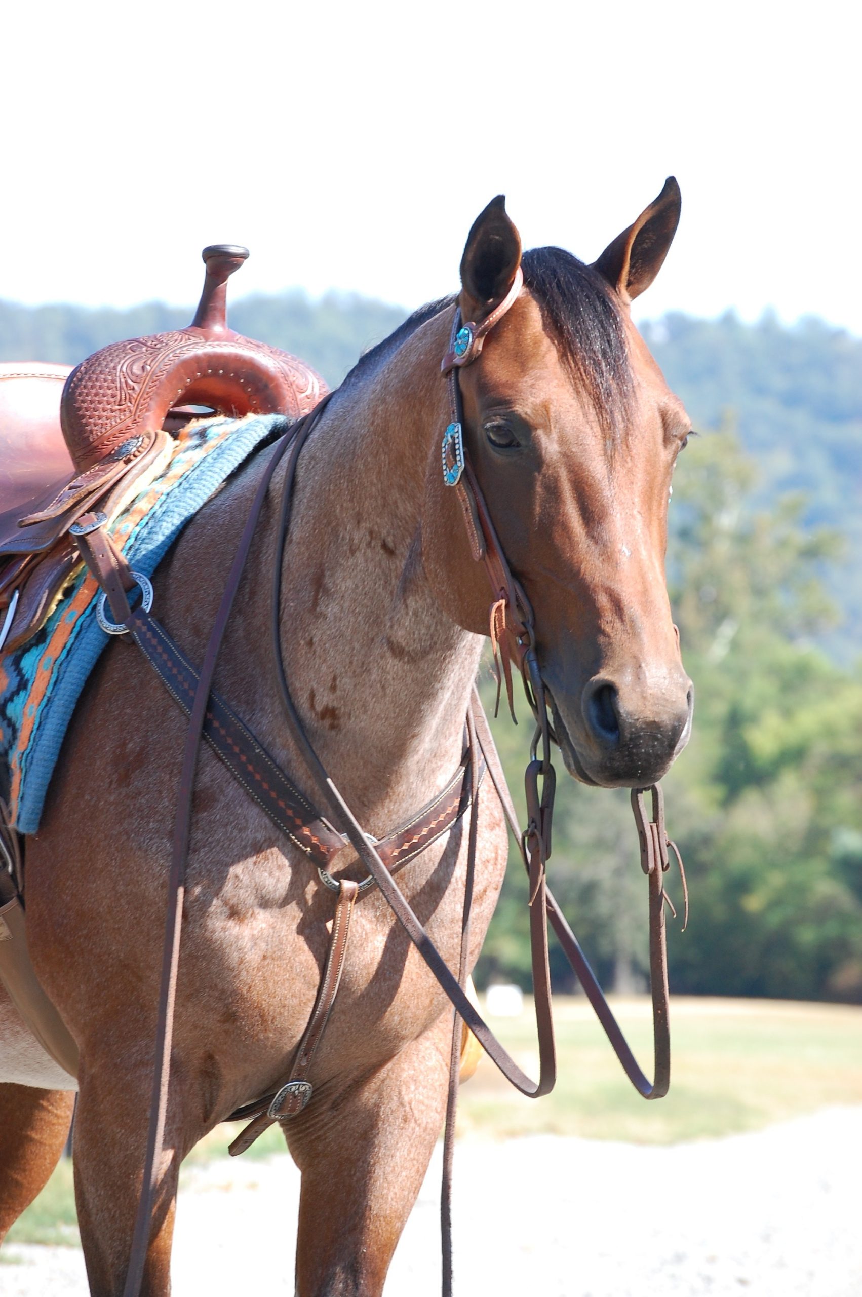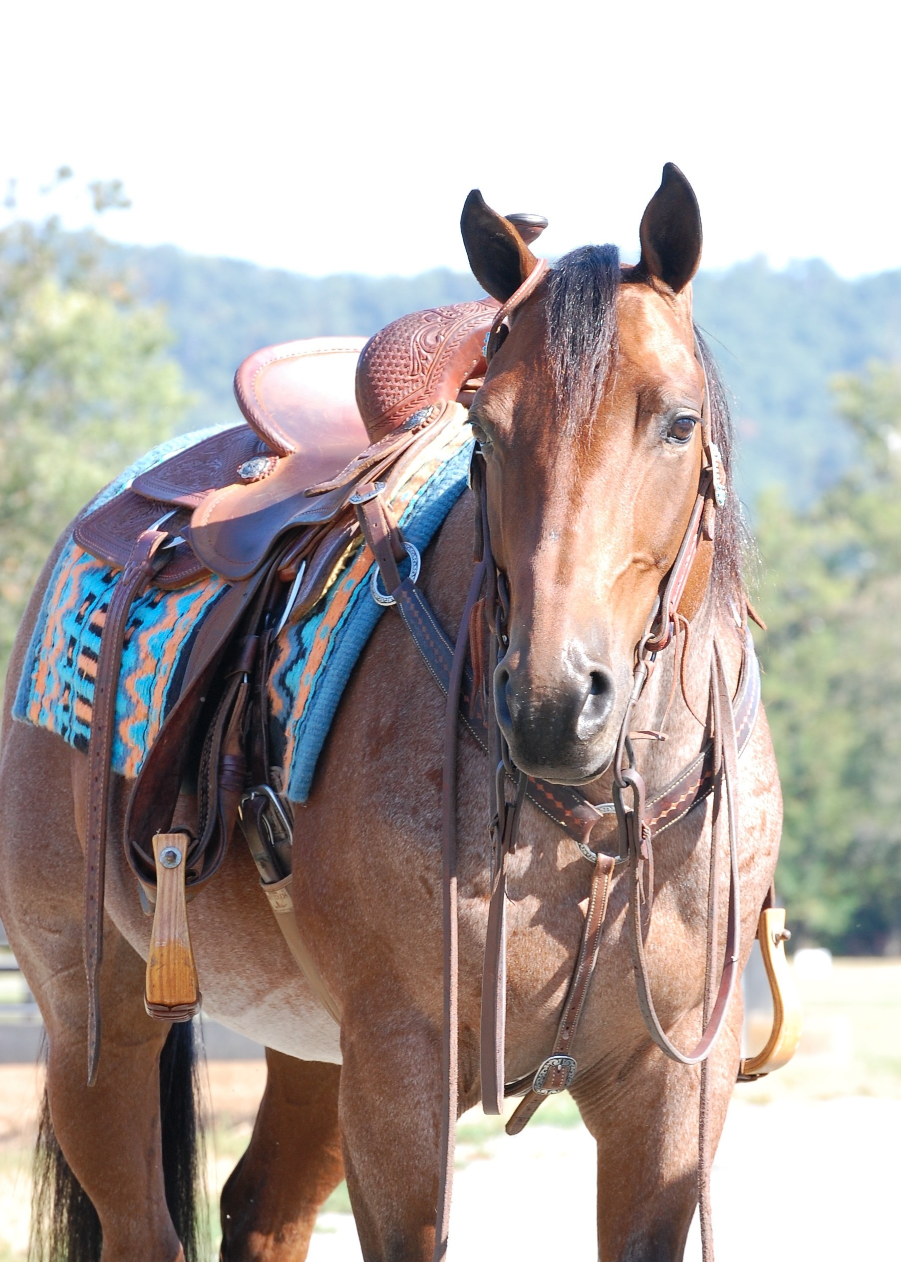 Pistol is a 9 year old AQHA Registered Bay Roan Gelding that is a ranch horse deluxe. Extremely quiet and gentle. Pistol has been ridden by kids and is suitable for the whole family. He is great in the arena and has had experience tracking and pushing cattle. He goes over arena obstacles, tracks the roping dummy, and is great on trails. Pistol has a kind, willing nature and is a pleasure to be around. Great in stall or turnout. Stands to be bathed, clipped, groomed, tacked and for vet/farrier. We can’t say enough good things about this sweet guy and we are proud to offer him. Safe, sound, no vices.