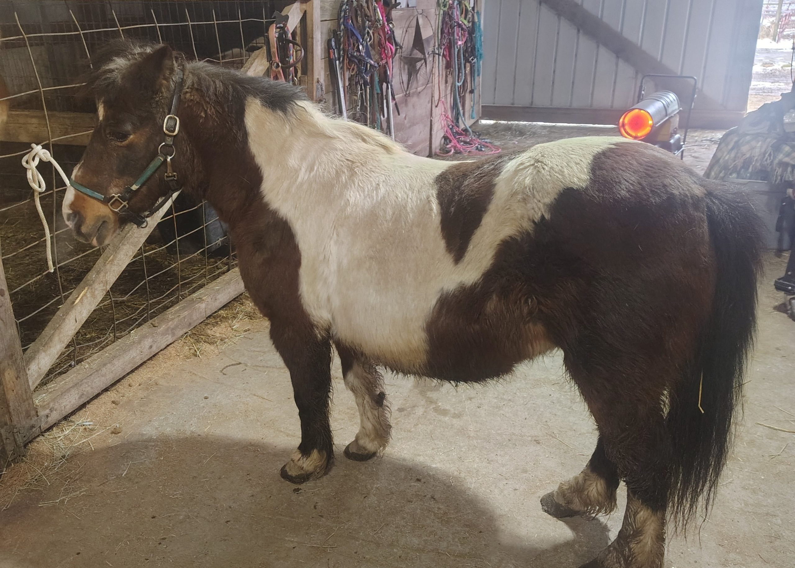 Description: Pixie is a 14-year-old 37-in tricolored paint mare broke like a big horse rides English and Western also broke to drive she has been exposed to a appy mini stud she walk trots and lopes off has been in parades and done birthday parties very safe easy to catch loads clips ties gets along with other animals in the pasture