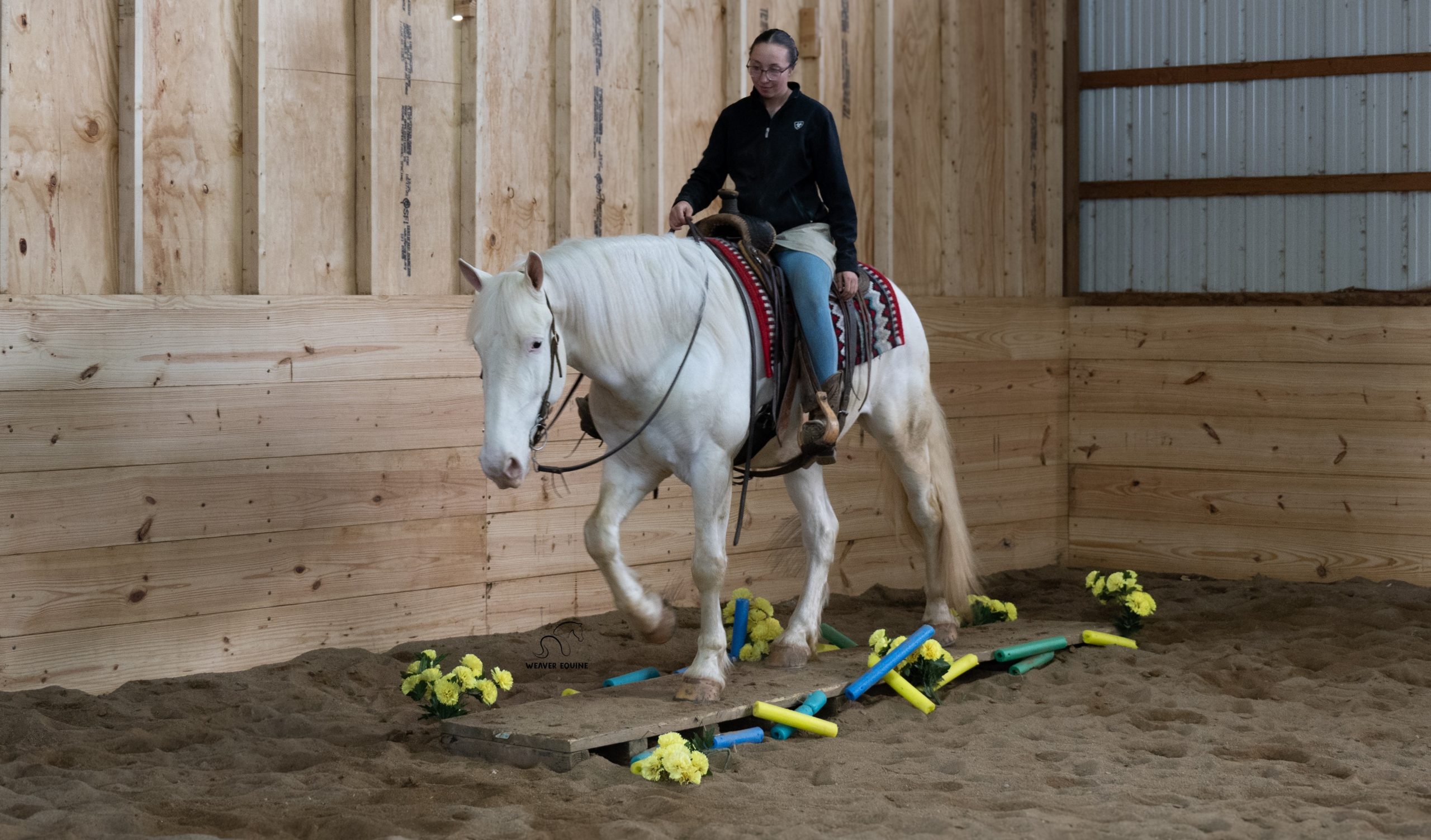 In the arena, he will lope a circle, he will pick up both leads, and even take a few jumps! He will stand nicely for a mounting block. He will stop and back up nicely when asked. He will move off of your legs, sidepass, whatever you please as Storm is not easily phased. He will walk trot and canter on command. He will cross obstacles with ease, does not mind a tarp or flag and will willingly try new things!